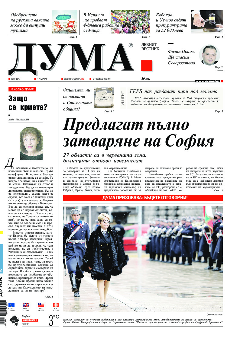 АБОНАМЕНТ за вестник „ДУМА“ за 2026 година. Можете да се абонирате в: „Български пощи“ АД до 15 декември 2025 г., „Доби прес“ ЕООД до 28 декември 2025 г., в редакцията на вестника до 20 декември 2025 г. Каталожен номер 6. Цени: 12 месеца - 149 € / 291,42 лв., 6 месеца - 75 € / 146,69 лв., 3 месеца - 40 € / 78,23 лв., 1 месец - 14 € / 27,38 лв. За повече информация тел. 02 9705 203 и 02 9705 216 отдел „Разпространение” на в-к ДУМА на ул. „Позитано” 20 А. E-mail: abonament@duma.bg АБОНАМЕНТ за вестник „ДУМА“ за 2026 година. Можете да се абонирате в: „Български пощи“ АД до 15 декември 2025 г., „Доби прес“ ЕООД до 28 декември 2025 г., в редакцията на вестника до 20 декември 2025 г. Каталожен номер 6. Цени: 12 месеца - 149 € / 291,42 лв., 6 месеца - 75 € / 146,69 лв., 3 месеца - 40 € / 78,23 лв., 1 месец - 14 € / 27,38 лв. За повече информация тел. 02 9705 203 и 02 9705 216 отдел „Разпространение” на в-к ДУМА на ул. „Позитано” 20 А. E-mail: abonament@duma.bg