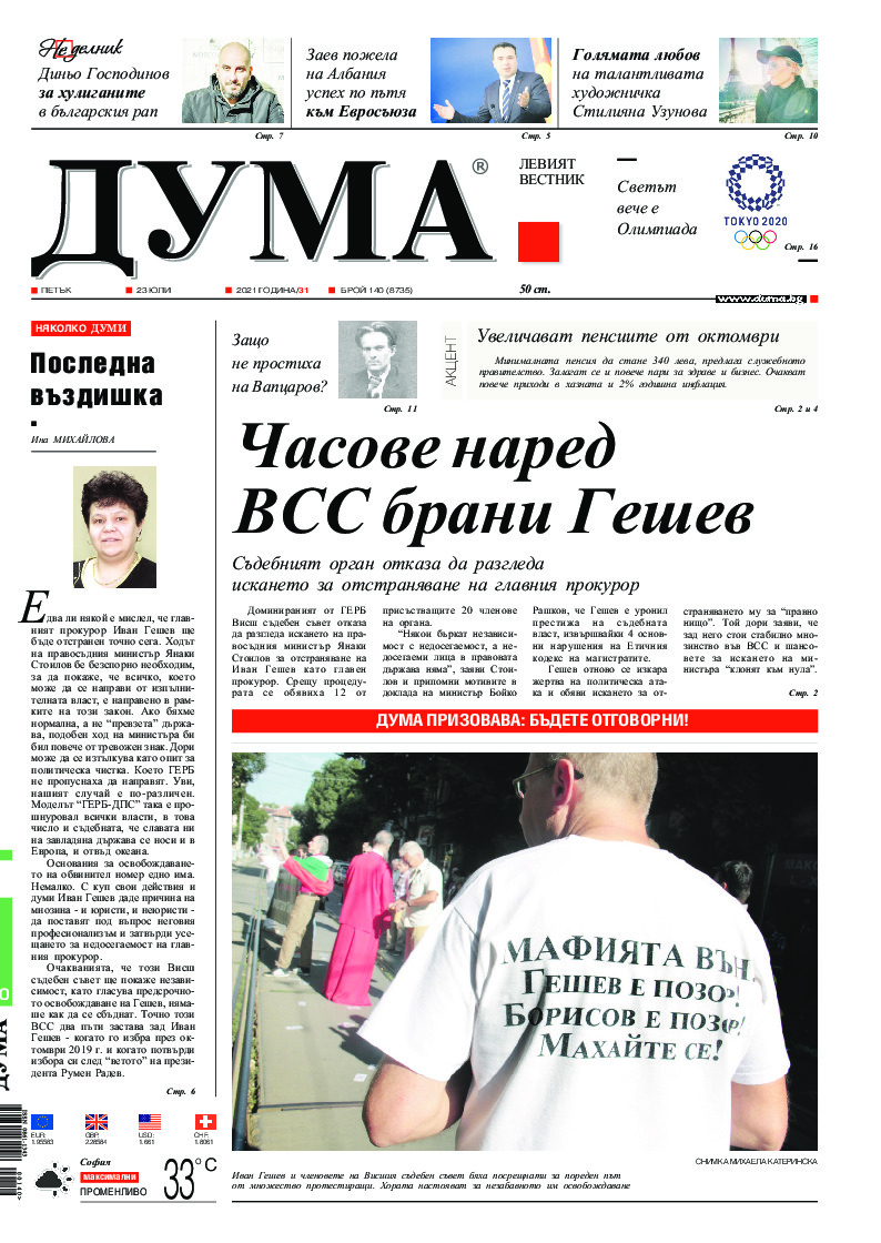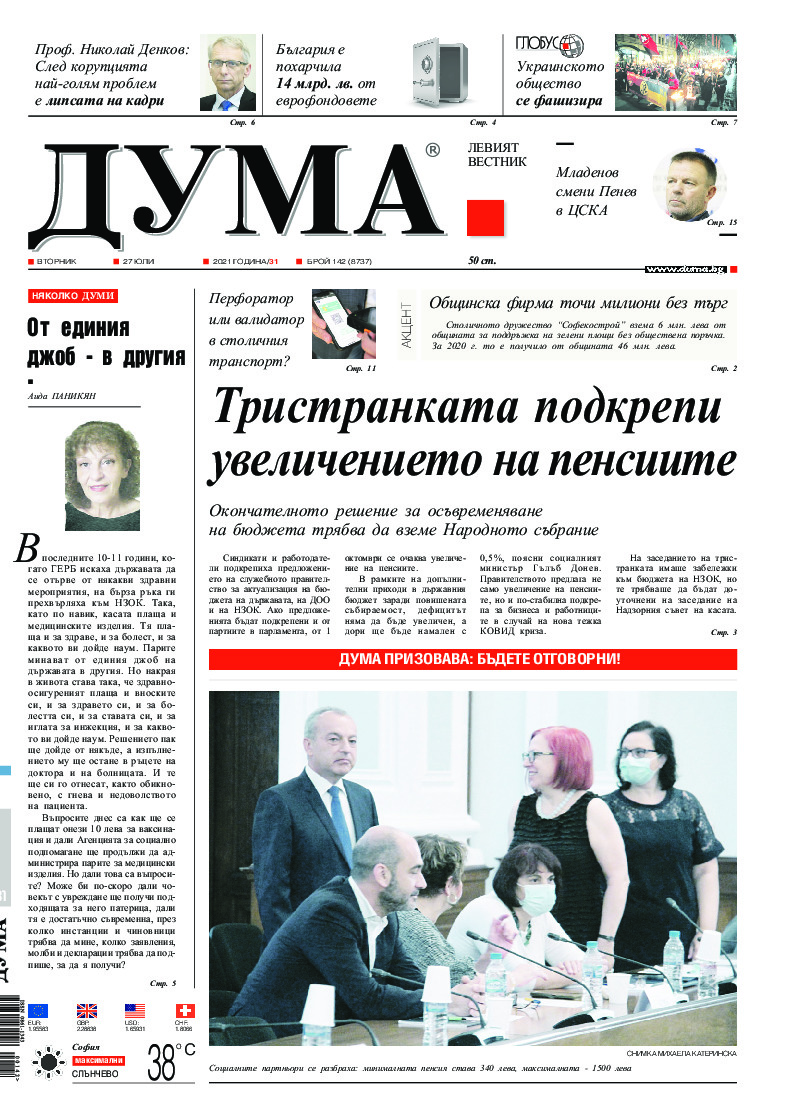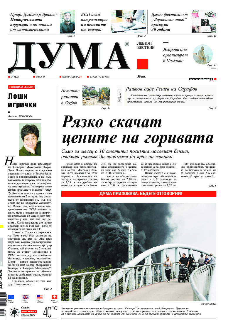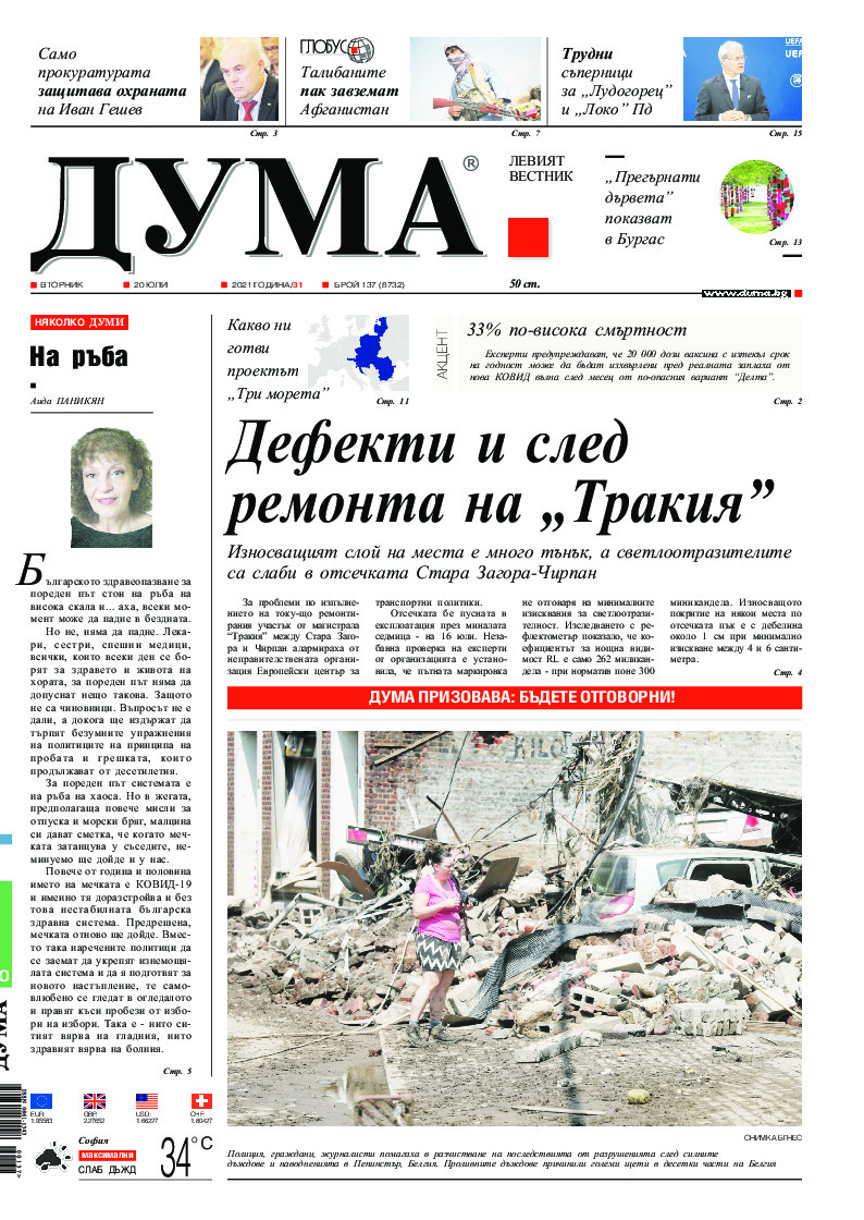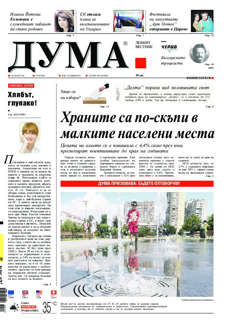 АБОНАМЕНТ за вестник „ДУМА“ за 2026 година. Можете да се абонирате в: „Български пощи“ АД до 15 декември 2025 г., „Доби прес“ ЕООД до 28 декември 2025 г., в редакцията на вестника до 20 декември 2025 г. Каталожен номер 6. Цени: 12 месеца - 149 € / 291,42 лв., 6 месеца - 75 € / 146,69 лв., 3 месеца - 40 € / 78,23 лв., 1 месец - 14 € / 27,38 лв. За повече информация тел. 02 9705 203 и 02 9705 216 отдел „Разпространение” на в-к ДУМА на ул. „Позитано” 20 А. E-mail: abonament@duma.bg АБОНАМЕНТ за вестник „ДУМА“ за 2026 година. Можете да се абонирате в: „Български пощи“ АД до 15 декември 2025 г., „Доби прес“ ЕООД до 28 декември 2025 г., в редакцията на вестника до 20 декември 2025 г. Каталожен номер 6. Цени: 12 месеца - 149 € / 291,42 лв., 6 месеца - 75 € / 146,69 лв., 3 месеца - 40 € / 78,23 лв., 1 месец - 14 € / 27,38 лв. За повече информация тел. 02 9705 203 и 02 9705 216 отдел „Разпространение” на в-к ДУМА на ул. „Позитано” 20 А. E-mail: abonament@duma.bg