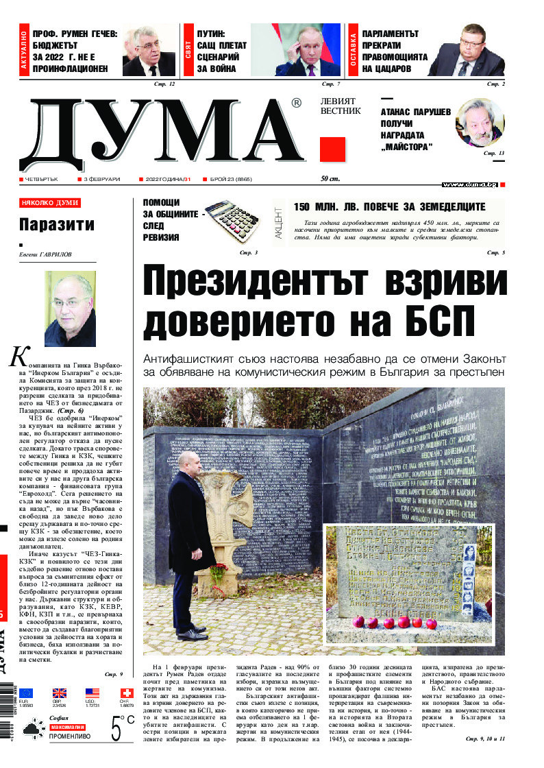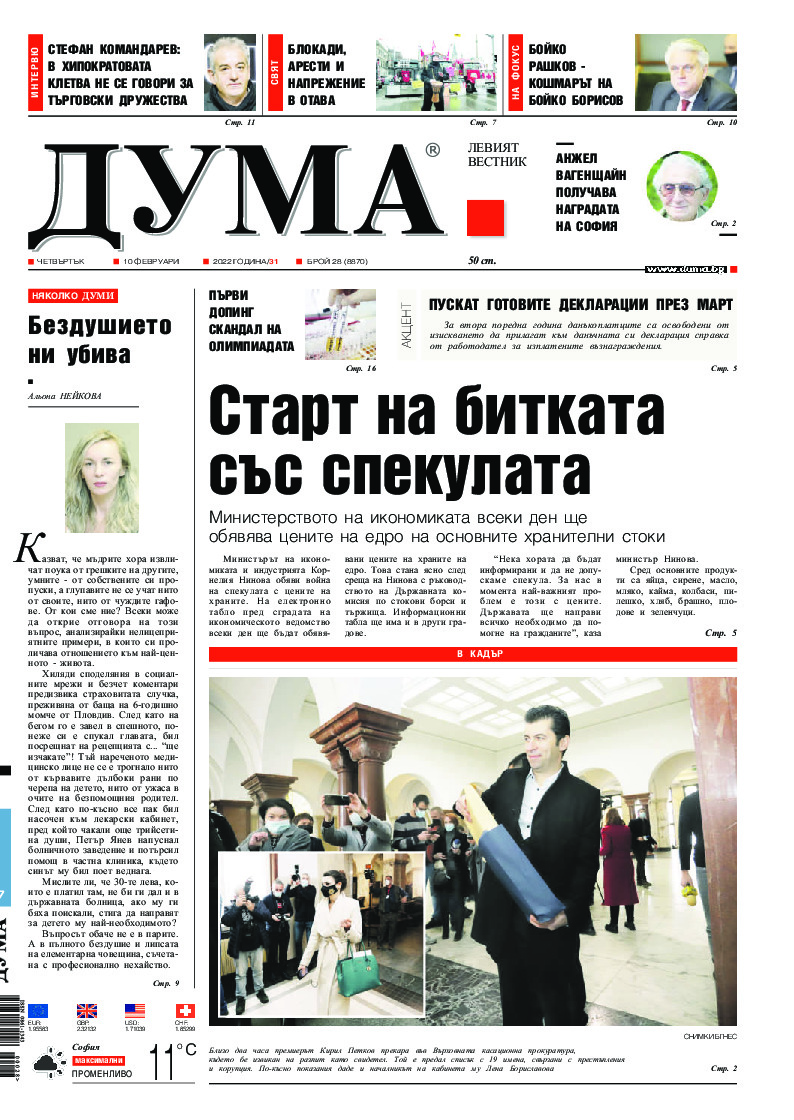 АБОНАМЕНТ за вестник „ДУМА“ за 2026 година. Можете да се абонирате в: „Български пощи“ АД до 15 декември 2025 г., „Доби прес“ ЕООД до 28 декември 2025 г., в редакцията на вестника до 20 декември 2025 г. Каталожен номер 6. Цени: 12 месеца - 149 € / 291,42 лв., 6 месеца - 75 € / 146,69 лв., 3 месеца - 40 € / 78,23 лв., 1 месец - 14 € / 27,38 лв. За повече информация тел. 02 9705 203 и 02 9705 216 отдел „Разпространение” на в-к ДУМА на ул. „Позитано” 20 А. E-mail: abonament@duma.bg АБОНАМЕНТ за вестник „ДУМА“ за 2026 година. Можете да се абонирате в: „Български пощи“ АД до 15 декември 2025 г., „Доби прес“ ЕООД до 28 декември 2025 г., в редакцията на вестника до 20 декември 2025 г. Каталожен номер 6. Цени: 12 месеца - 149 € / 291,42 лв., 6 месеца - 75 € / 146,69 лв., 3 месеца - 40 € / 78,23 лв., 1 месец - 14 € / 27,38 лв. За повече информация тел. 02 9705 203 и 02 9705 216 отдел „Разпространение” на в-к ДУМА на ул. „Позитано” 20 А. E-mail: abonament@duma.bg
