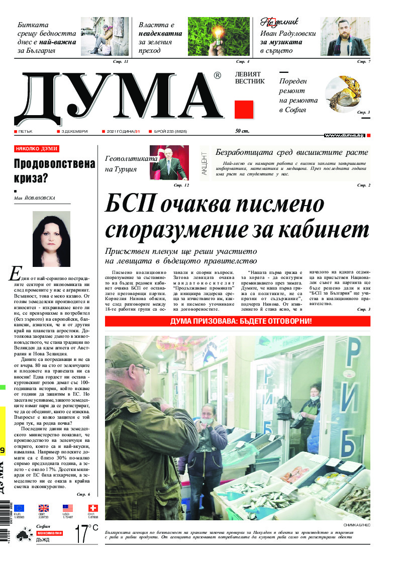 АБОНАМЕНТ за вестник „ДУМА“ за 2026 година. Можете да се абонирате в: „Български пощи“ АД до 15 декември 2025 г., „Доби прес“ ЕООД до 28 декември 2025 г., в редакцията на вестника до 20 декември 2025 г. Каталожен номер 6. Цени: 12 месеца - 149 € / 291,42 лв., 6 месеца - 75 € / 146,69 лв., 3 месеца - 40 € / 78,23 лв., 1 месец - 14 € / 27,38 лв. За повече информация тел. 02 9705 203 и 02 9705 216 отдел „Разпространение” на в-к ДУМА на ул. „Позитано” 20 А. E-mail: abonament@duma.bg АБОНАМЕНТ за вестник „ДУМА“ за 2026 година. Можете да се абонирате в: „Български пощи“ АД до 15 декември 2025 г., „Доби прес“ ЕООД до 28 декември 2025 г., в редакцията на вестника до 20 декември 2025 г. Каталожен номер 6. Цени: 12 месеца - 149 € / 291,42 лв., 6 месеца - 75 € / 146,69 лв., 3 месеца - 40 € / 78,23 лв., 1 месец - 14 € / 27,38 лв. За повече информация тел. 02 9705 203 и 02 9705 216 отдел „Разпространение” на в-к ДУМА на ул. „Позитано” 20 А. E-mail: abonament@duma.bg