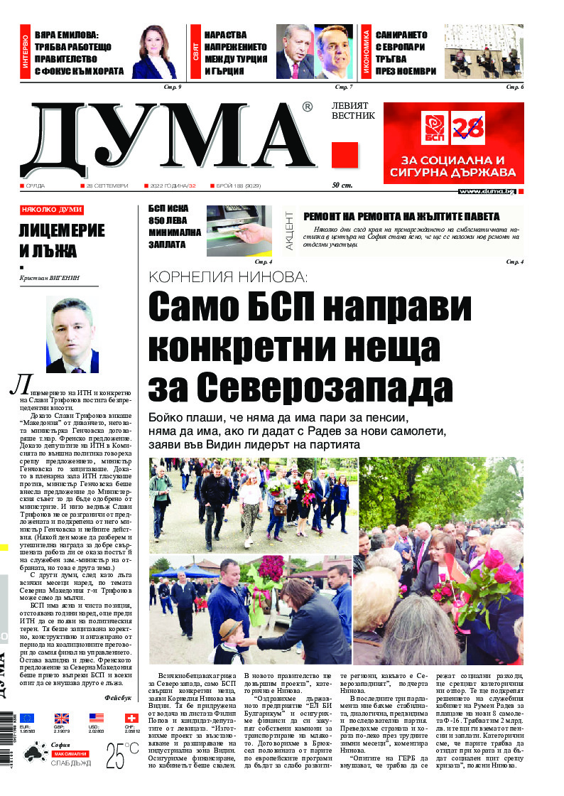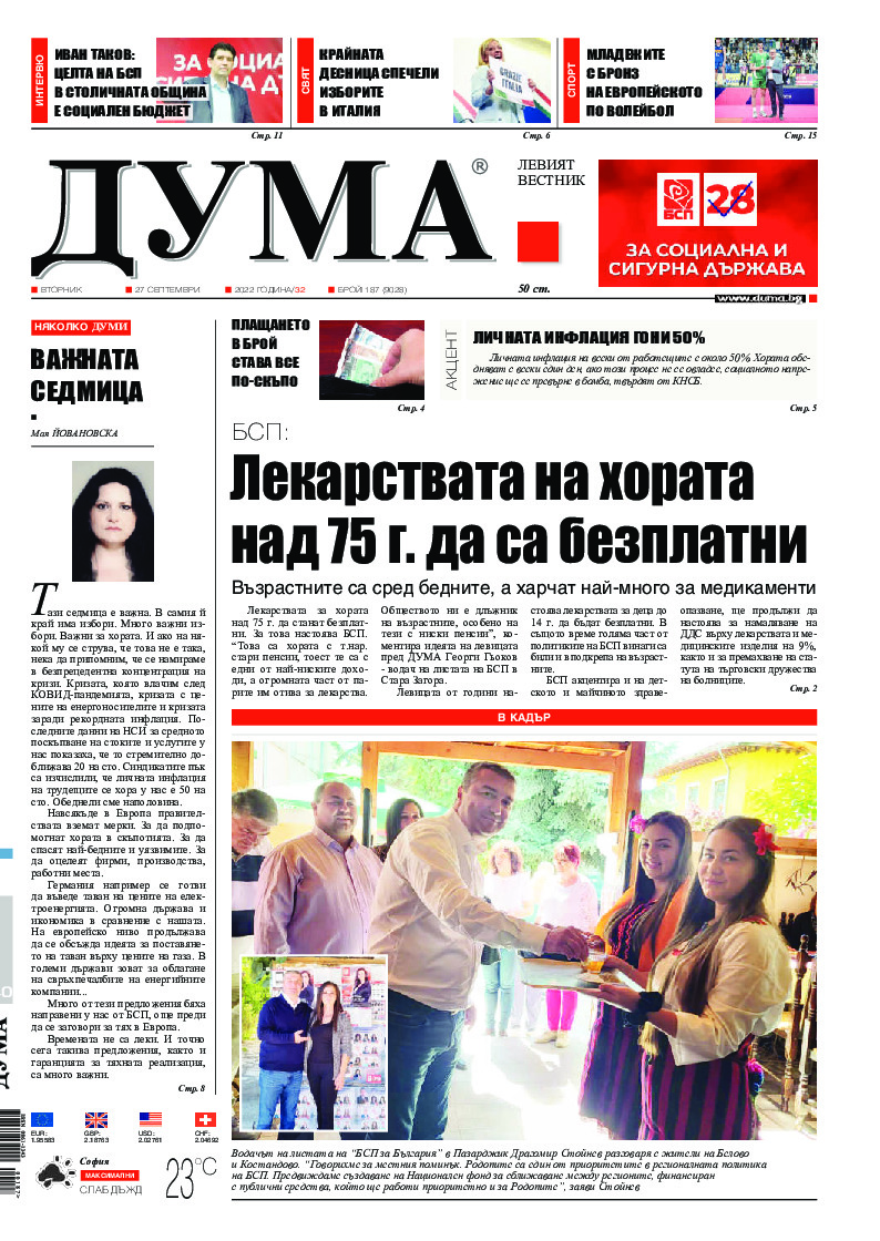 АБОНАМЕНТ за вестник „ДУМА“ за 2026 година. Можете да се абонирате в: „Български пощи“ АД до 15 декември 2025 г., „Доби прес“ ЕООД до 28 декември 2025 г., в редакцията на вестника до 20 декември 2025 г. Каталожен номер 6. Цени: 12 месеца - 149 € / 291,42 лв., 6 месеца - 75 € / 146,69 лв., 3 месеца - 40 € / 78,23 лв., 1 месец - 14 € / 27,38 лв. За повече информация тел. 02 9705 203 и 02 9705 216 отдел „Разпространение” на в-к ДУМА на ул. „Позитано” 20 А. E-mail: abonament@duma.bg АБОНАМЕНТ за вестник „ДУМА“ за 2026 година. Можете да се абонирате в: „Български пощи“ АД до 15 декември 2025 г., „Доби прес“ ЕООД до 28 декември 2025 г., в редакцията на вестника до 20 декември 2025 г. Каталожен номер 6. Цени: 12 месеца - 149 € / 291,42 лв., 6 месеца - 75 € / 146,69 лв., 3 месеца - 40 € / 78,23 лв., 1 месец - 14 € / 27,38 лв. За повече информация тел. 02 9705 203 и 02 9705 216 отдел „Разпространение” на в-к ДУМА на ул. „Позитано” 20 А. E-mail: abonament@duma.bg