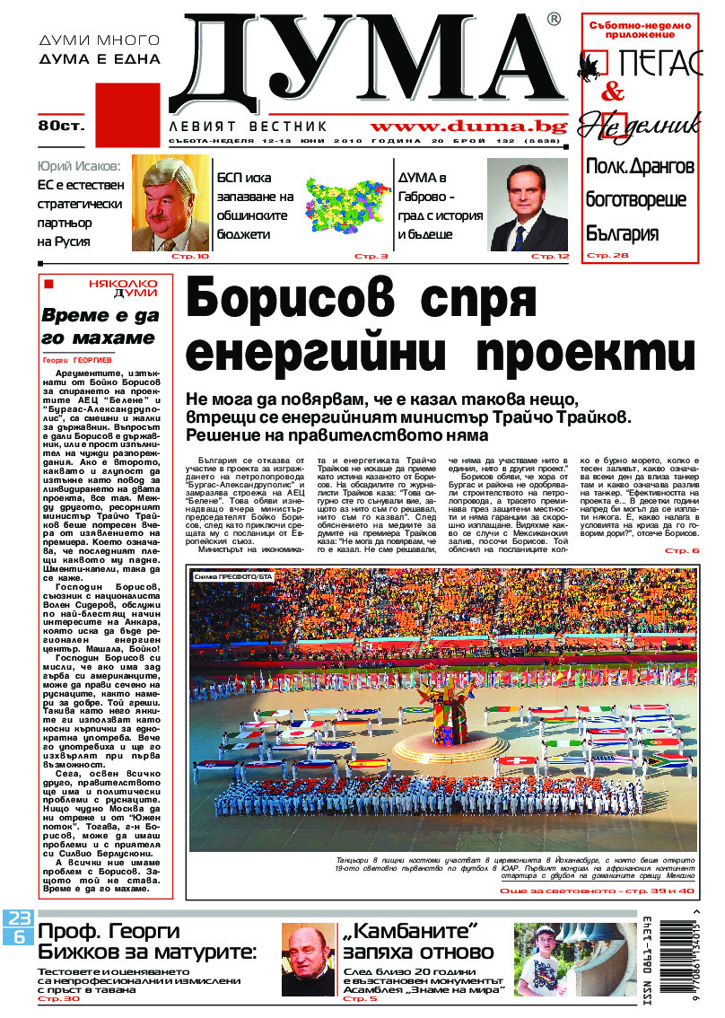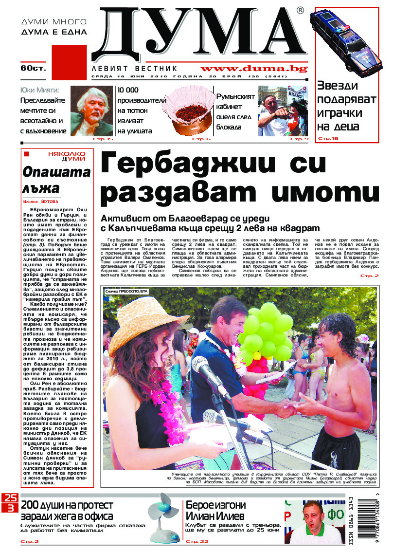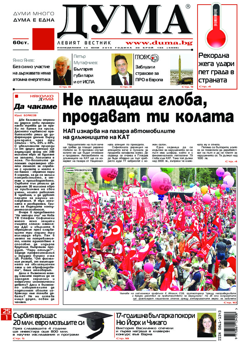 АБОНАМЕНТ за вестник „ДУМА“ за 2026 година. Можете да се абонирате в: „Български пощи“ АД до 15 декември 2025 г., „Доби прес“ ЕООД до 28 декември 2025 г., в редакцията на вестника до 20 декември 2025 г. Каталожен номер 6. Цени: 12 месеца - 149 € / 291,42 лв., 6 месеца - 75 € / 146,69 лв., 3 месеца - 40 € / 78,23 лв., 1 месец - 14 € / 27,38 лв. За повече информация тел. 02 9705 203 и 02 9705 216 отдел „Разпространение” на в-к ДУМА на ул. „Позитано” 20 А. E-mail: abonament@duma.bg АБОНАМЕНТ за вестник „ДУМА“ за 2026 година. Можете да се абонирате в: „Български пощи“ АД до 15 декември 2025 г., „Доби прес“ ЕООД до 28 декември 2025 г., в редакцията на вестника до 20 декември 2025 г. Каталожен номер 6. Цени: 12 месеца - 149 € / 291,42 лв., 6 месеца - 75 € / 146,69 лв., 3 месеца - 40 € / 78,23 лв., 1 месец - 14 € / 27,38 лв. За повече информация тел. 02 9705 203 и 02 9705 216 отдел „Разпространение” на в-к ДУМА на ул. „Позитано” 20 А. E-mail: abonament@duma.bg