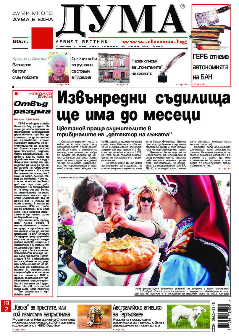 АБОНАМЕНТ за вестник „ДУМА“ за 2026 година. Можете да се абонирате в: „Български пощи“ АД до 15 декември 2025 г., „Доби прес“ ЕООД до 28 декември 2025 г., в редакцията на вестника до 20 декември 2025 г. Каталожен номер 6. Цени: 12 месеца - 149 € / 291,42 лв., 6 месеца - 75 € / 146,69 лв., 3 месеца - 40 € / 78,23 лв., 1 месец - 14 € / 27,38 лв. За повече информация тел. 02 9705 203 и 02 9705 216 отдел „Разпространение” на в-к ДУМА на ул. „Позитано” 20 А. E-mail: abonament@duma.bg АБОНАМЕНТ за вестник „ДУМА“ за 2026 година. Можете да се абонирате в: „Български пощи“ АД до 15 декември 2025 г., „Доби прес“ ЕООД до 28 декември 2025 г., в редакцията на вестника до 20 декември 2025 г. Каталожен номер 6. Цени: 12 месеца - 149 € / 291,42 лв., 6 месеца - 75 € / 146,69 лв., 3 месеца - 40 € / 78,23 лв., 1 месец - 14 € / 27,38 лв. За повече информация тел. 02 9705 203 и 02 9705 216 отдел „Разпространение” на в-к ДУМА на ул. „Позитано” 20 А. E-mail: abonament@duma.bg