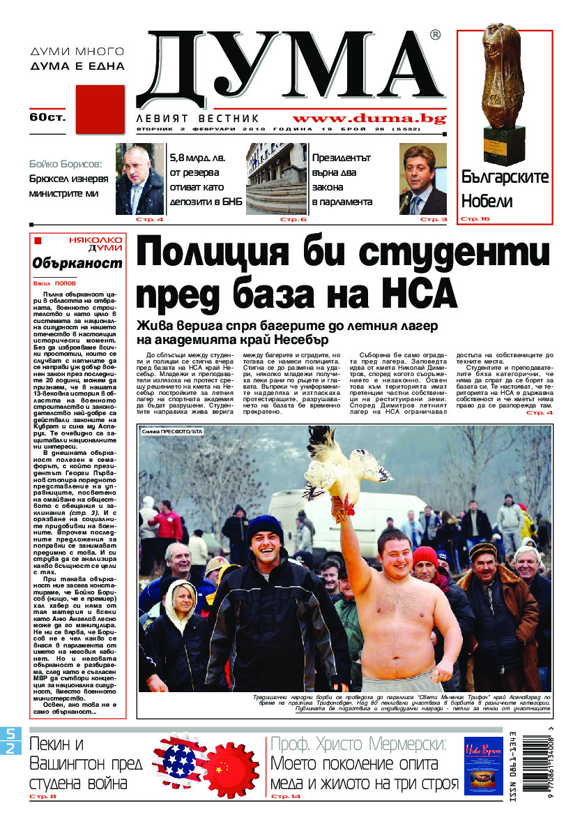 АБОНАМЕНТ за вестник „ДУМА“ за 2026 година. Можете да се абонирате в: „Български пощи“ АД до 15 декември 2025 г., „Доби прес“ ЕООД до 28 декември 2025 г., в редакцията на вестника до 20 декември 2025 г. Каталожен номер 6. Цени: 12 месеца - 149 € / 291,42 лв., 6 месеца - 75 € / 146,69 лв., 3 месеца - 40 € / 78,23 лв., 1 месец - 14 € / 27,38 лв. За повече информация тел. 02 9705 203 и 02 9705 216 отдел „Разпространение” на в-к ДУМА на ул. „Позитано” 20 А. E-mail: abonament@duma.bg АБОНАМЕНТ за вестник „ДУМА“ за 2026 година. Можете да се абонирате в: „Български пощи“ АД до 15 декември 2025 г., „Доби прес“ ЕООД до 28 декември 2025 г., в редакцията на вестника до 20 декември 2025 г. Каталожен номер 6. Цени: 12 месеца - 149 € / 291,42 лв., 6 месеца - 75 € / 146,69 лв., 3 месеца - 40 € / 78,23 лв., 1 месец - 14 € / 27,38 лв. За повече информация тел. 02 9705 203 и 02 9705 216 отдел „Разпространение” на в-к ДУМА на ул. „Позитано” 20 А. E-mail: abonament@duma.bg