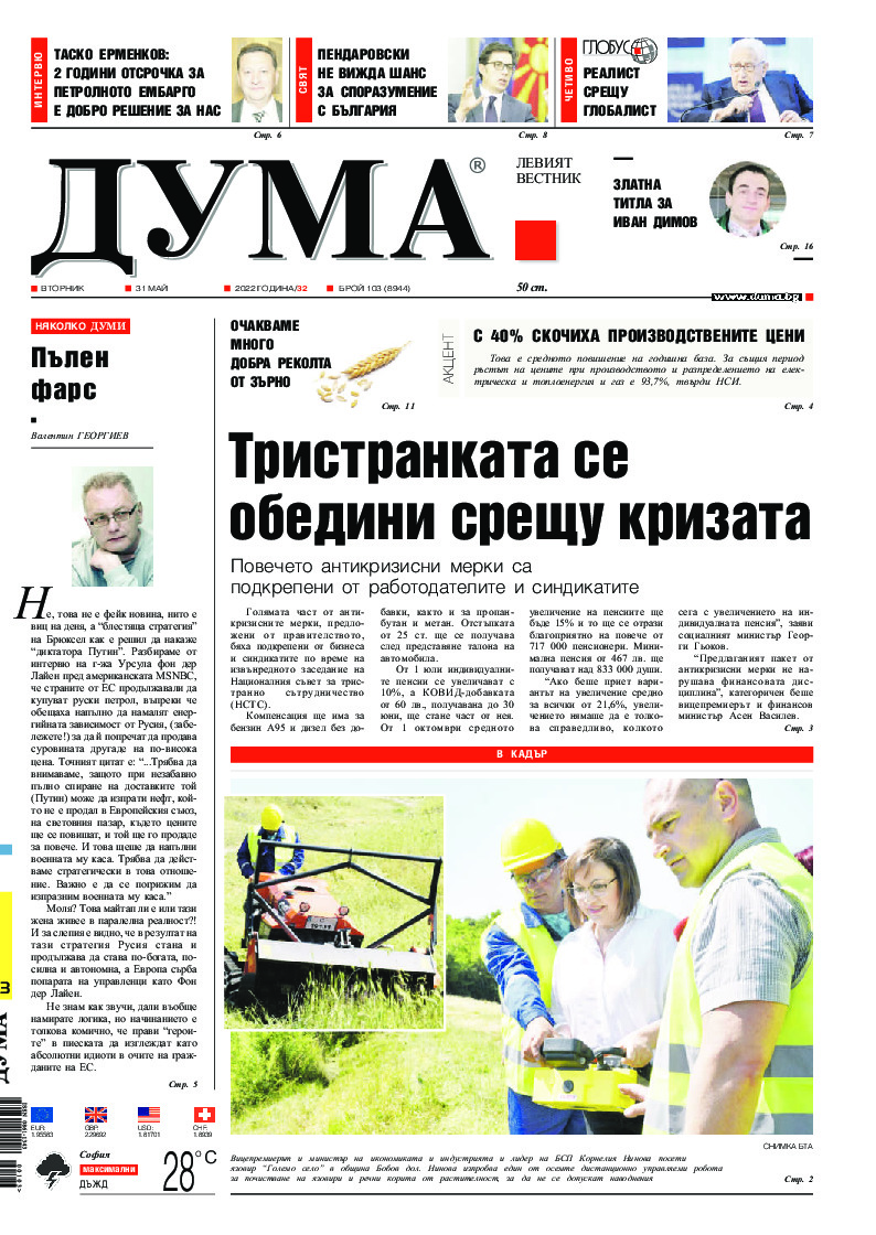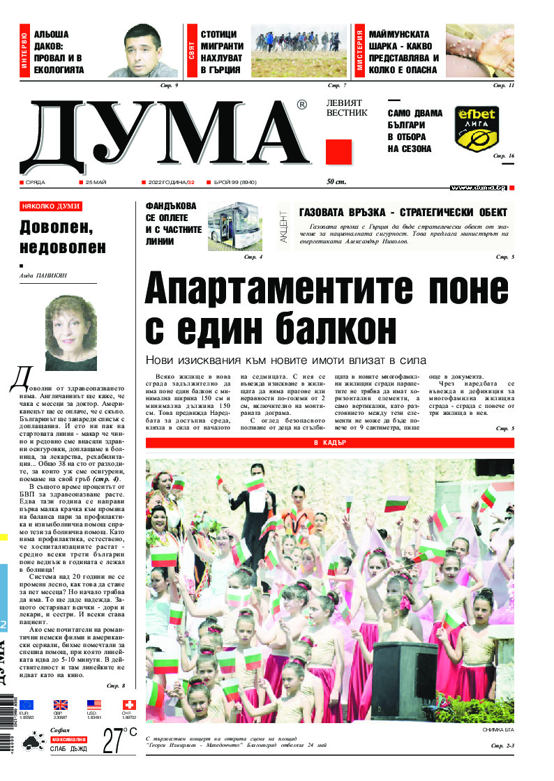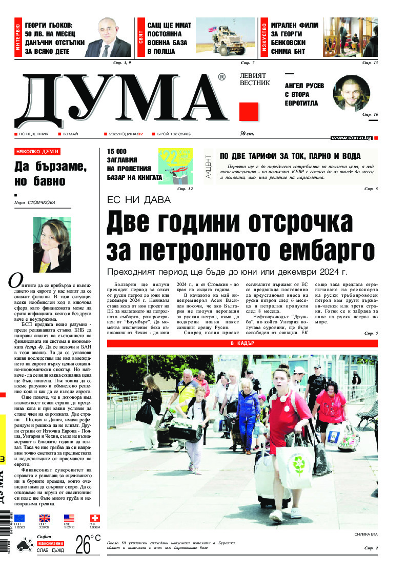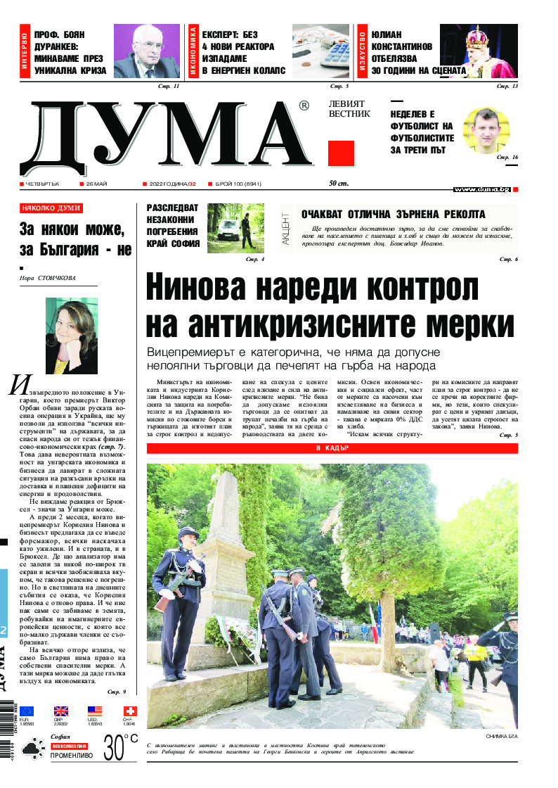 АБОНАМЕНТ за вестник „ДУМА“ за 2026 година. Можете да се абонирате в: „Български пощи“ АД до 15 декември 2025 г., „Доби прес“ ЕООД до 28 декември 2025 г., в редакцията на вестника до 20 декември 2025 г. Каталожен номер 6. Цени: 12 месеца - 149 € / 291,42 лв., 6 месеца - 75 € / 146,69 лв., 3 месеца - 40 € / 78,23 лв., 1 месец - 14 € / 27,38 лв. За повече информация тел. 02 9705 203 и 02 9705 216 отдел „Разпространение” на в-к ДУМА на ул. „Позитано” 20 А. E-mail: abonament@duma.bg АБОНАМЕНТ за вестник „ДУМА“ за 2026 година. Можете да се абонирате в: „Български пощи“ АД до 15 декември 2025 г., „Доби прес“ ЕООД до 28 декември 2025 г., в редакцията на вестника до 20 декември 2025 г. Каталожен номер 6. Цени: 12 месеца - 149 € / 291,42 лв., 6 месеца - 75 € / 146,69 лв., 3 месеца - 40 € / 78,23 лв., 1 месец - 14 € / 27,38 лв. За повече информация тел. 02 9705 203 и 02 9705 216 отдел „Разпространение” на в-к ДУМА на ул. „Позитано” 20 А. E-mail: abonament@duma.bg
