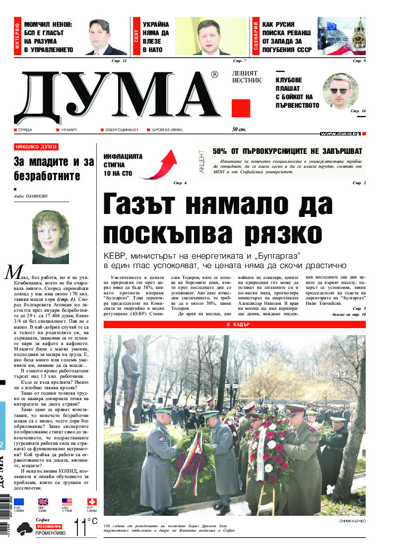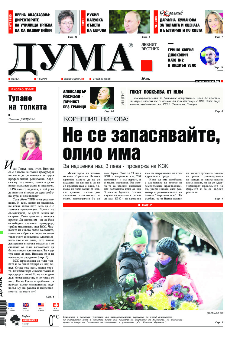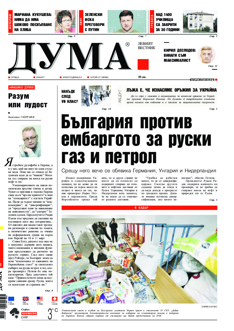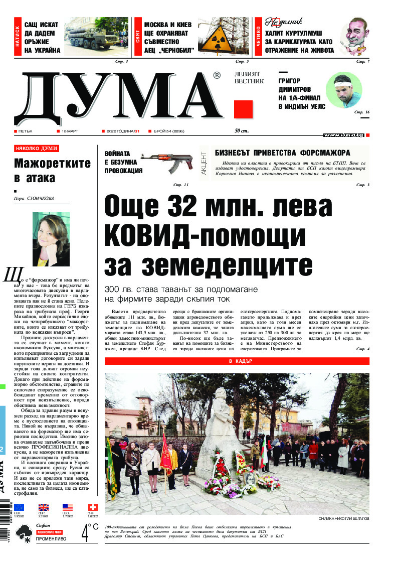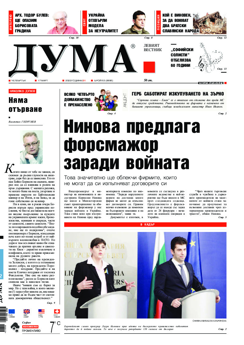 АБОНАМЕНТ за вестник „ДУМА“ за 2026 година. Можете да се абонирате в: „Български пощи“ АД до 15 декември 2025 г., „Доби прес“ ЕООД до 28 декември 2025 г., в редакцията на вестника до 20 декември 2025 г. Каталожен номер 6. Цени: 12 месеца - 149 € / 291,42 лв., 6 месеца - 75 € / 146,69 лв., 3 месеца - 40 € / 78,23 лв., 1 месец - 14 € / 27,38 лв. За повече информация тел. 02 9705 203 и 02 9705 216 отдел „Разпространение” на в-к ДУМА на ул. „Позитано” 20 А. E-mail: abonament@duma.bg АБОНАМЕНТ за вестник „ДУМА“ за 2026 година. Можете да се абонирате в: „Български пощи“ АД до 15 декември 2025 г., „Доби прес“ ЕООД до 28 декември 2025 г., в редакцията на вестника до 20 декември 2025 г. Каталожен номер 6. Цени: 12 месеца - 149 € / 291,42 лв., 6 месеца - 75 € / 146,69 лв., 3 месеца - 40 € / 78,23 лв., 1 месец - 14 € / 27,38 лв. За повече информация тел. 02 9705 203 и 02 9705 216 отдел „Разпространение” на в-к ДУМА на ул. „Позитано” 20 А. E-mail: abonament@duma.bg