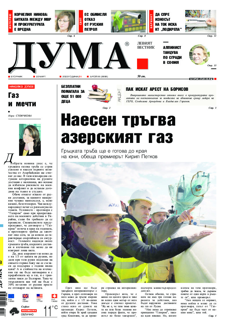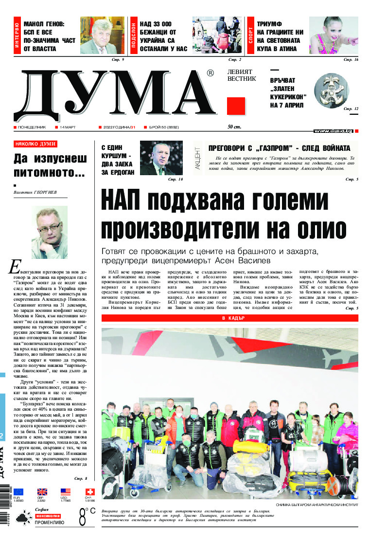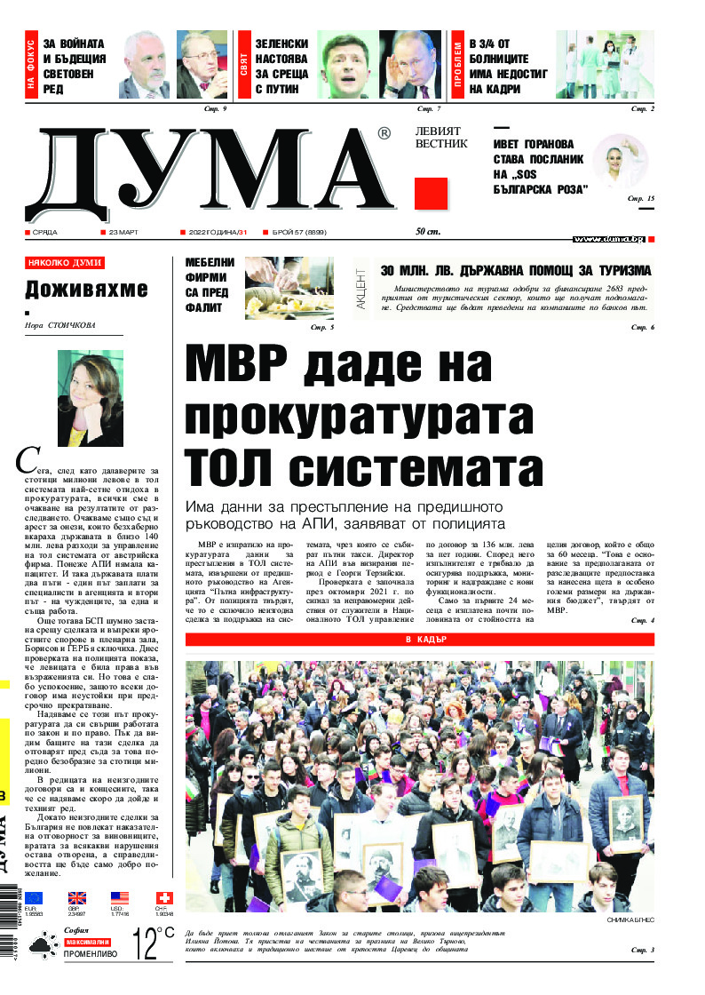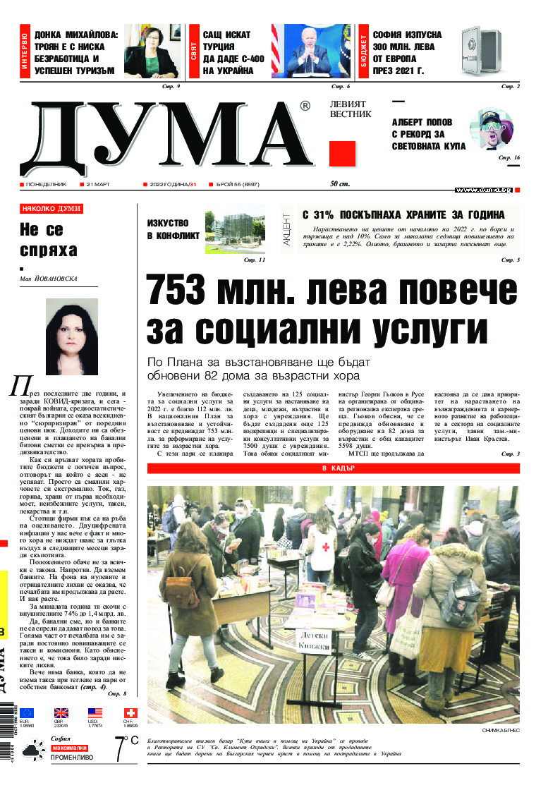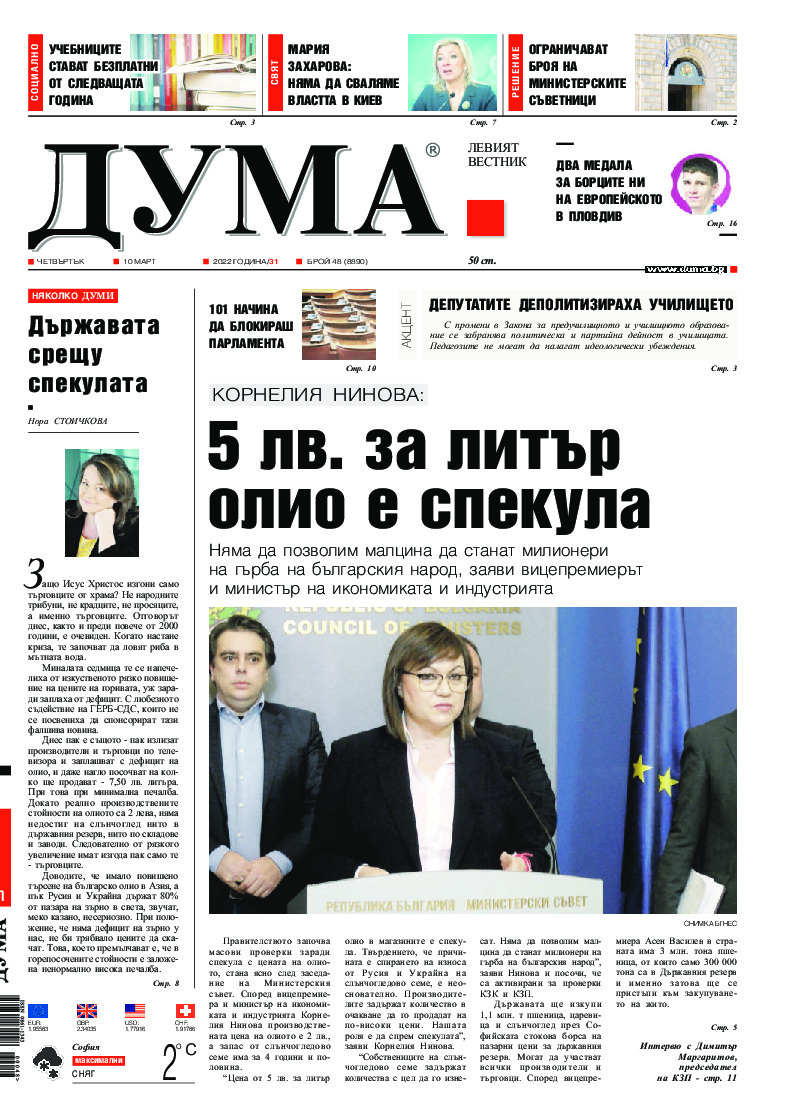 АБОНАМЕНТ за вестник „ДУМА“ за 2026 година. Можете да се абонирате в: „Български пощи“ АД до 15 декември 2025 г., „Доби прес“ ЕООД до 28 декември 2025 г., в редакцията на вестника до 20 декември 2025 г. Каталожен номер 6. Цени: 12 месеца - 149 € / 291,42 лв., 6 месеца - 75 € / 146,69 лв., 3 месеца - 40 € / 78,23 лв., 1 месец - 14 € / 27,38 лв. За повече информация тел. 02 9705 203 и 02 9705 216 отдел „Разпространение” на в-к ДУМА на ул. „Позитано” 20 А. E-mail: abonament@duma.bg АБОНАМЕНТ за вестник „ДУМА“ за 2026 година. Можете да се абонирате в: „Български пощи“ АД до 15 декември 2025 г., „Доби прес“ ЕООД до 28 декември 2025 г., в редакцията на вестника до 20 декември 2025 г. Каталожен номер 6. Цени: 12 месеца - 149 € / 291,42 лв., 6 месеца - 75 € / 146,69 лв., 3 месеца - 40 € / 78,23 лв., 1 месец - 14 € / 27,38 лв. За повече информация тел. 02 9705 203 и 02 9705 216 отдел „Разпространение” на в-к ДУМА на ул. „Позитано” 20 А. E-mail: abonament@duma.bg