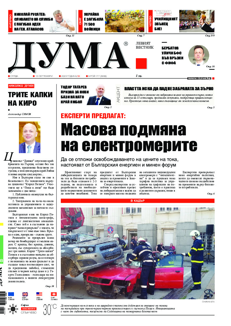 АБОНАМЕНТ за вестник „ДУМА“ за 2026 година. Можете да се абонирате в: „Български пощи“ АД до 15 декември 2025 г., „Доби прес“ ЕООД до 28 декември 2025 г., в редакцията на вестника до 20 декември 2025 г. Каталожен номер 6. Цени: 12 месеца - 149 € / 291,42 лв., 6 месеца - 75 € / 146,69 лв., 3 месеца - 40 € / 78,23 лв., 1 месец - 14 € / 27,38 лв. За повече информация тел. 02 9705 203 и 02 9705 216 отдел „Разпространение” на в-к ДУМА на ул. „Позитано” 20 А. E-mail: abonament@duma.bg АБОНАМЕНТ за вестник „ДУМА“ за 2026 година. Можете да се абонирате в: „Български пощи“ АД до 15 декември 2025 г., „Доби прес“ ЕООД до 28 декември 2025 г., в редакцията на вестника до 20 декември 2025 г. Каталожен номер 6. Цени: 12 месеца - 149 € / 291,42 лв., 6 месеца - 75 € / 146,69 лв., 3 месеца - 40 € / 78,23 лв., 1 месец - 14 € / 27,38 лв. За повече информация тел. 02 9705 203 и 02 9705 216 отдел „Разпространение” на в-к ДУМА на ул. „Позитано” 20 А. E-mail: abonament@duma.bg