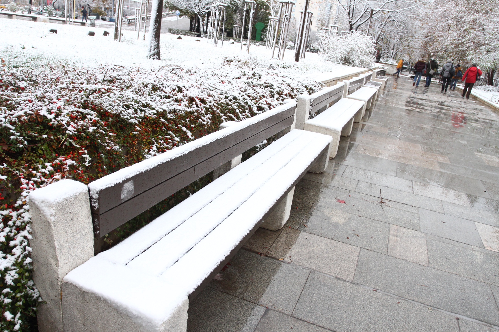 Първият сняг покри столицата в неделя вечер, но температурите над нулата не позволиха на софиянци да му се порадват дълго. Снегът бързо се стопи, а това помогна на столична община да се похвали с разчистени улици и тротоари.