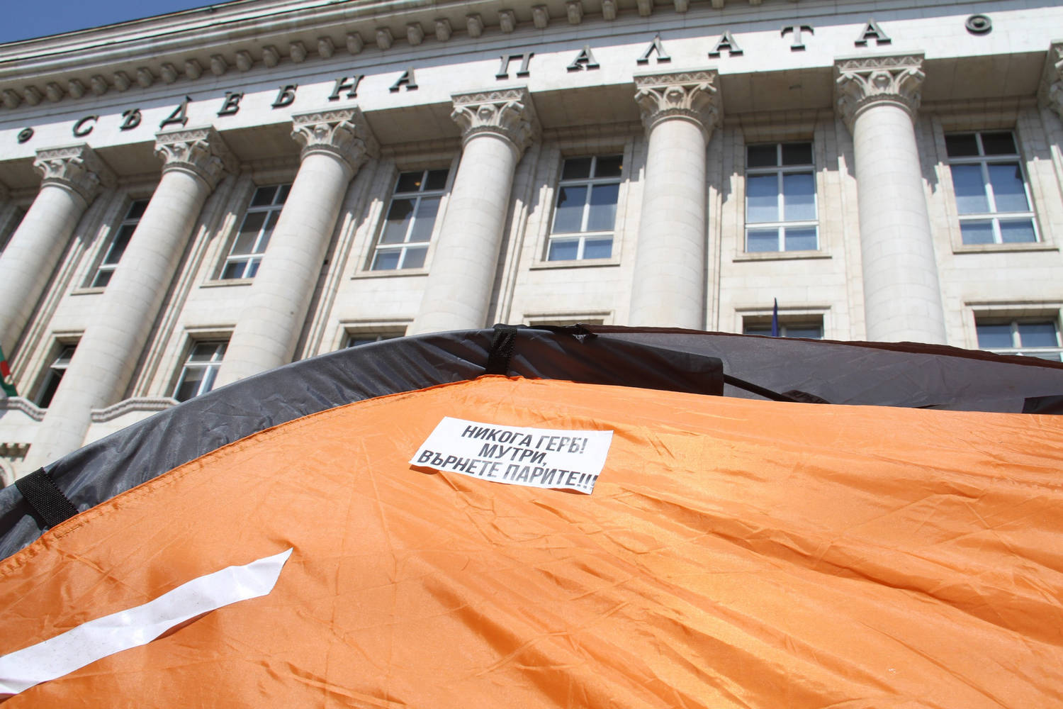Протестиращи опънаха палатки пред Съдебната палата в София. Те настояват за оставката на главния прокурор Иван Гешев и се заканиха да не го допускат до работното му място. Снимки Михаела Катеринска