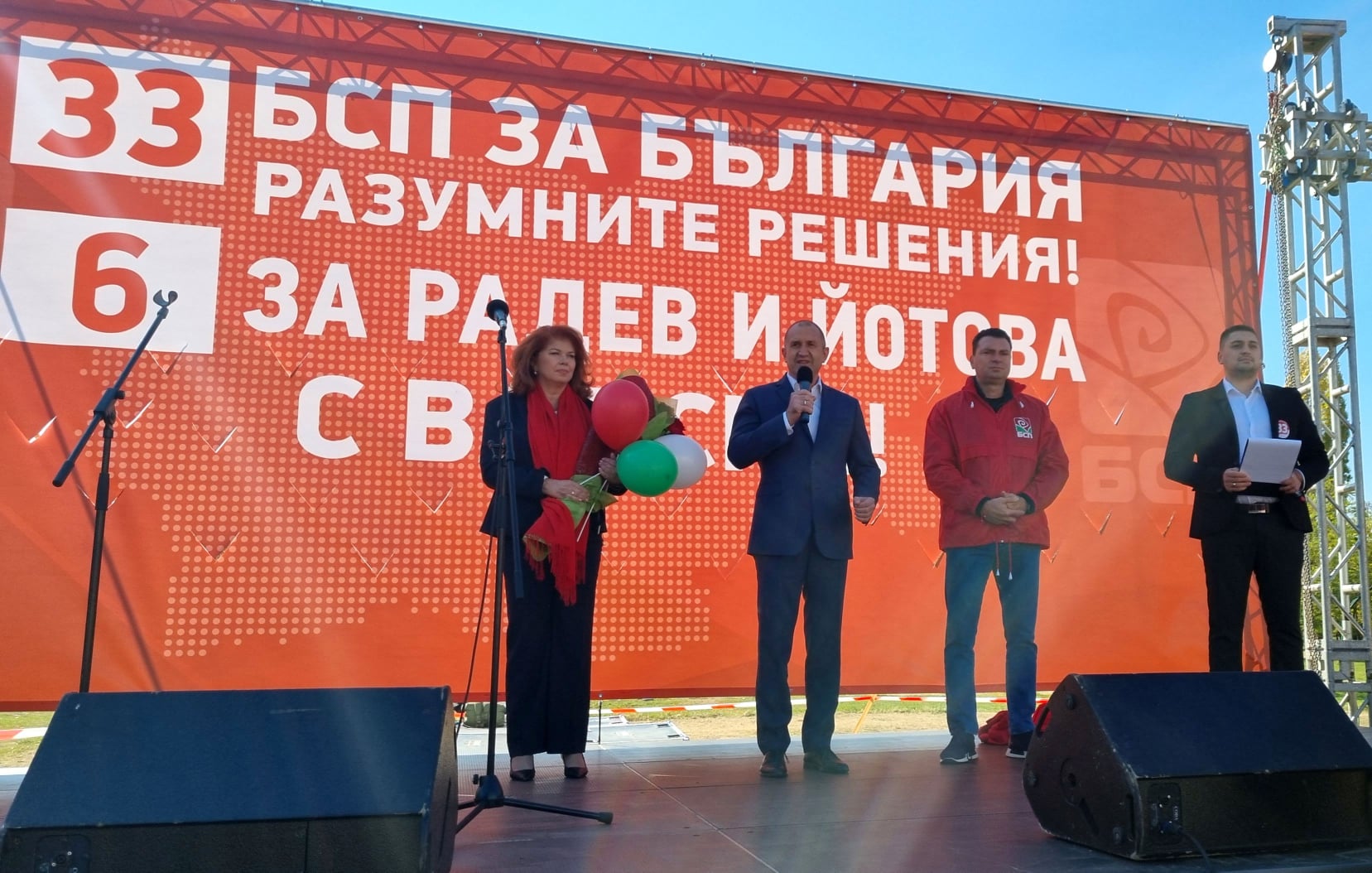 "Заедно с вас преди 5 години тръгнахме към победата и я постигнахме, когато малцина я очакваха. Аз съм щастлив, че от началото досега ние сме неразделни с един силен, опитен, стойностен човек - г-жа Йотова, член на БСП. Няма да ви предадем", заяви Радев пред симпатизантите и членовете на левицата. Председателят на БСП и водач на листата в 25-и МИР Корнелия Нинова припомни от сцената, че левицата разполага с план за изваждането на България от кризата. "За да стане това факт, най-голямото предизвикателство пред нас е парламент, стабилно мнозинство и редовно правителство. Сега не е време за партийци, а е време за държавници. Не е време за популизъм, а за отговорност и за смелост. Хората, които ще поемат управлението на страната, ще понесат много тежести, много удари, но ще останат в историята, ако успеят да преведат България и хората през трудностите. Вярвам, че ние от "БСП за България" сме тези хора - отговорни, смели, знаещи и можещи", увери тя.
