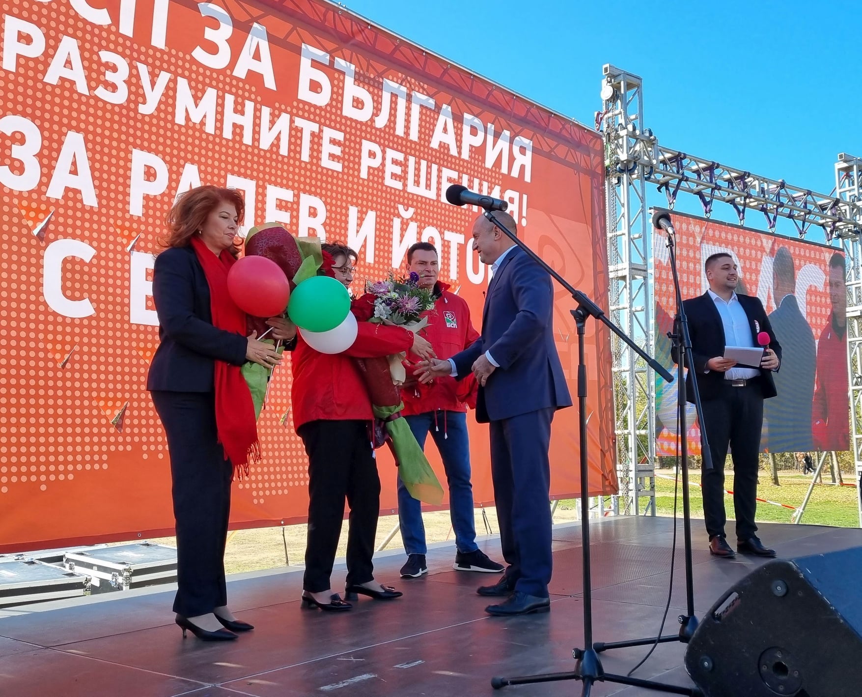 "Заедно с вас преди 5 години тръгнахме към победата и я постигнахме, когато малцина я очакваха. Аз съм щастлив, че от началото досега ние сме неразделни с един силен, опитен, стойностен човек - г-жа Йотова, член на БСП. Няма да ви предадем", заяви Радев пред симпатизантите и членовете на левицата. Председателят на БСП и водач на листата в 25-и МИР Корнелия Нинова припомни от сцената, че левицата разполага с план за изваждането на България от кризата. "За да стане това факт, най-голямото предизвикателство пред нас е парламент, стабилно мнозинство и редовно правителство. Сега не е време за партийци, а е време за държавници. Не е време за популизъм, а за отговорност и за смелост. Хората, които ще поемат управлението на страната, ще понесат много тежести, много удари, но ще останат в историята, ако успеят да преведат България и хората през трудностите. Вярвам, че ние от "БСП за България" сме тези хора - отговорни, смели, знаещи и можещи", увери тя.
