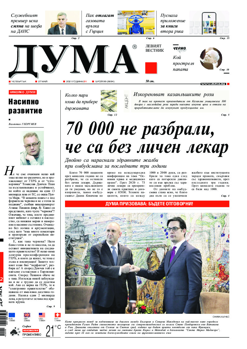 АБОНАМЕНТ за вестник „ДУМА“ за 2026 година. Можете да се абонирате в: „Български пощи“ АД до 15 декември 2025 г., „Доби прес“ ЕООД до 28 декември 2025 г., в редакцията на вестника до 20 декември 2025 г. Каталожен номер 6. Цени: 12 месеца - 149 € / 291,42 лв., 6 месеца - 75 € / 146,69 лв., 3 месеца - 40 € / 78,23 лв., 1 месец - 14 € / 27,38 лв. За повече информация тел. 02 9705 203 и 02 9705 216 отдел „Разпространение” на в-к ДУМА на ул. „Позитано” 20 А. E-mail: abonament@duma.bg АБОНАМЕНТ за вестник „ДУМА“ за 2026 година. Можете да се абонирате в: „Български пощи“ АД до 15 декември 2025 г., „Доби прес“ ЕООД до 28 декември 2025 г., в редакцията на вестника до 20 декември 2025 г. Каталожен номер 6. Цени: 12 месеца - 149 € / 291,42 лв., 6 месеца - 75 € / 146,69 лв., 3 месеца - 40 € / 78,23 лв., 1 месец - 14 € / 27,38 лв. За повече информация тел. 02 9705 203 и 02 9705 216 отдел „Разпространение” на в-к ДУМА на ул. „Позитано” 20 А. E-mail: abonament@duma.bg