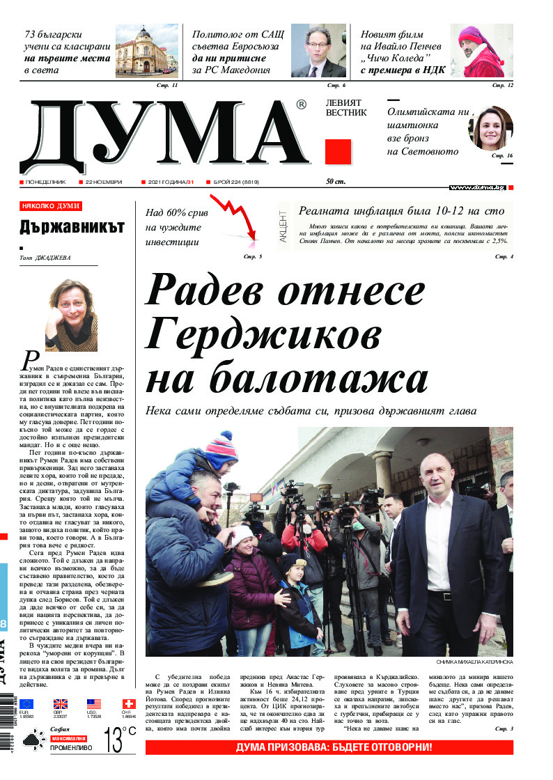 АБОНАМЕНТ за вестник „ДУМА“ за 2026 година. Можете да се абонирате в: „Български пощи“ АД до 15 декември 2025 г., „Доби прес“ ЕООД до 28 декември 2025 г., в редакцията на вестника до 20 декември 2025 г. Каталожен номер 6. Цени: 12 месеца - 149 € / 291,42 лв., 6 месеца - 75 € / 146,69 лв., 3 месеца - 40 € / 78,23 лв., 1 месец - 14 € / 27,38 лв. За повече информация тел. 02 9705 203 и 02 9705 216 отдел „Разпространение” на в-к ДУМА на ул. „Позитано” 20 А. E-mail: abonament@duma.bg АБОНАМЕНТ за вестник „ДУМА“ за 2026 година. Можете да се абонирате в: „Български пощи“ АД до 15 декември 2025 г., „Доби прес“ ЕООД до 28 декември 2025 г., в редакцията на вестника до 20 декември 2025 г. Каталожен номер 6. Цени: 12 месеца - 149 € / 291,42 лв., 6 месеца - 75 € / 146,69 лв., 3 месеца - 40 € / 78,23 лв., 1 месец - 14 € / 27,38 лв. За повече информация тел. 02 9705 203 и 02 9705 216 отдел „Разпространение” на в-к ДУМА на ул. „Позитано” 20 А. E-mail: abonament@duma.bg