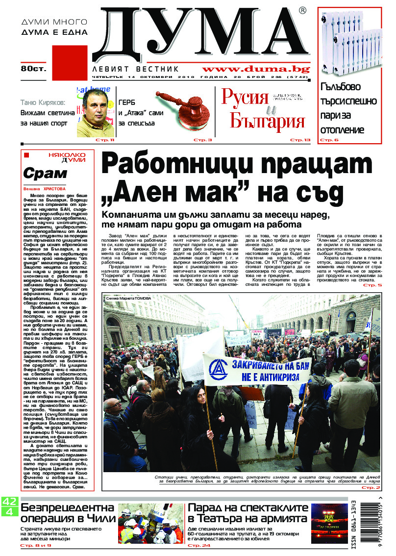АБОНАМЕНТ за вестник „ДУМА“ за 2026 година. Можете да се абонирате в: „Български пощи“ АД до 15 декември 2025 г., „Доби прес“ ЕООД до 28 декември 2025 г., в редакцията на вестника до 20 декември 2025 г. Каталожен номер 6. Цени: 12 месеца - 149 € / 291,42 лв., 6 месеца - 75 € / 146,69 лв., 3 месеца - 40 € / 78,23 лв., 1 месец - 14 € / 27,38 лв. За повече информация тел. 02 9705 203 и 02 9705 216 отдел „Разпространение” на в-к ДУМА на ул. „Позитано” 20 А. E-mail: abonament@duma.bg АБОНАМЕНТ за вестник „ДУМА“ за 2026 година. Можете да се абонирате в: „Български пощи“ АД до 15 декември 2025 г., „Доби прес“ ЕООД до 28 декември 2025 г., в редакцията на вестника до 20 декември 2025 г. Каталожен номер 6. Цени: 12 месеца - 149 € / 291,42 лв., 6 месеца - 75 € / 146,69 лв., 3 месеца - 40 € / 78,23 лв., 1 месец - 14 € / 27,38 лв. За повече информация тел. 02 9705 203 и 02 9705 216 отдел „Разпространение” на в-к ДУМА на ул. „Позитано” 20 А. E-mail: abonament@duma.bg