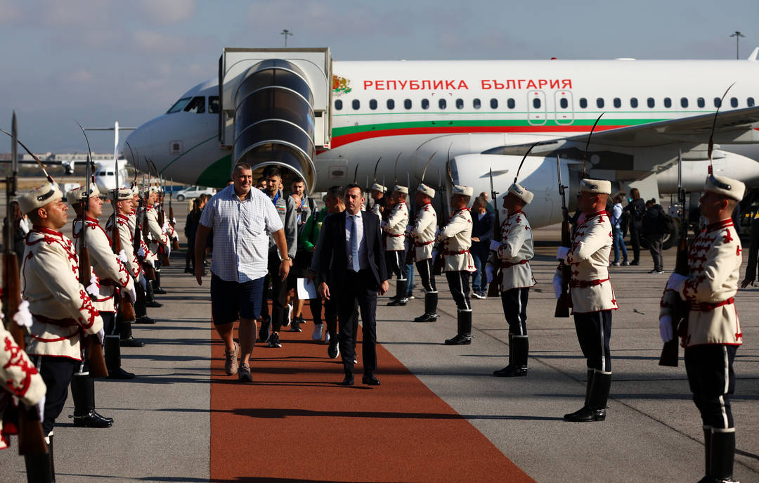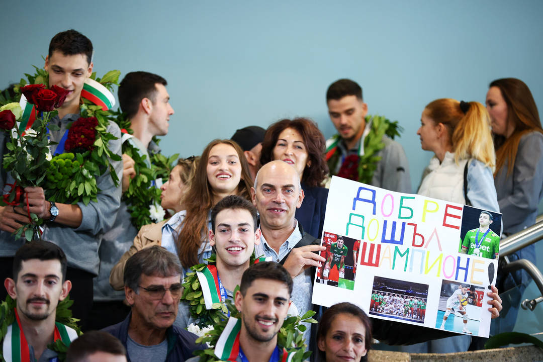Спортният министър Иван Пешев и шефът на Федерацията по волейбол Любо Ганев предвождат на летище "Васил Левски" националния отбор, който се прибра от Истанбул с правителствения самолет