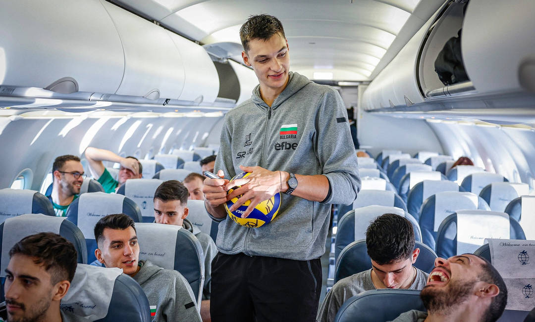 Новият лидер на волейболистите ни Александър Николов разписва топка, върху която още в самолета автографи сложиха всички национали