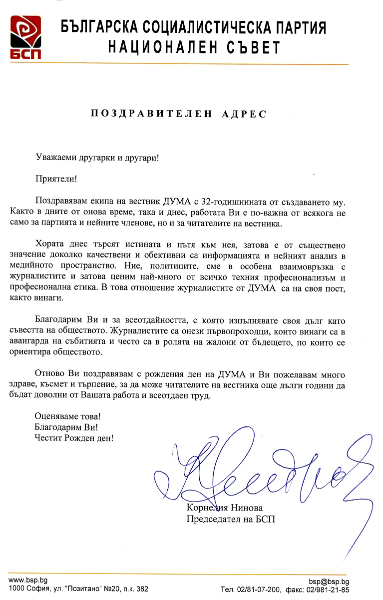"Поздравявам екипа на вестник ДУМА с 32-годишнината от създаването му. Както в дните от онова време, така и днес, работата ви е по-важна от всякога не само за партията и нейните членове, но и за читателите на вестника", каза в поздравителния адрес към редакцията Нинова.