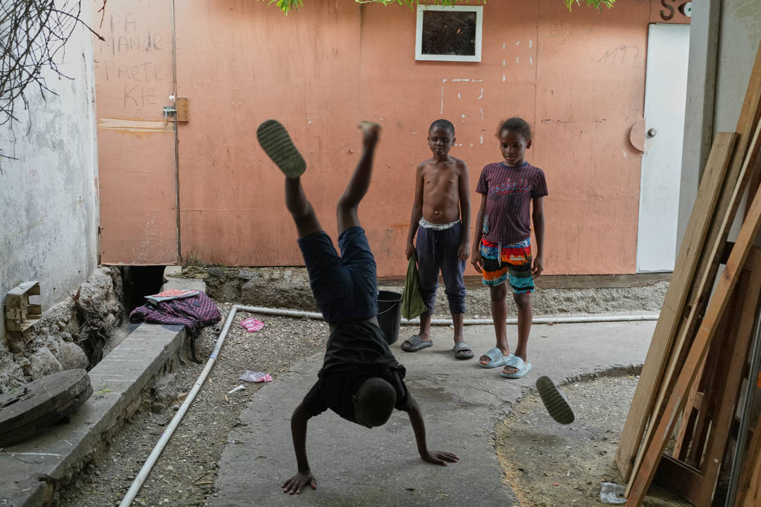 Малко дете в Хаити наднича зад завесите на временното си жилище да провери дали е безопасно да излезе навън. Уличните банди контролират все по-голяма част от страната. Управляващите и военните наемници от чужбина не успяват да се преборят с престъпността