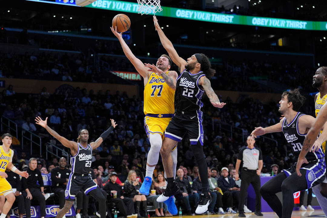 Лука Дончич атакува коша на Голдън Стейт през Девин Картър (вдясно) при загубата на Лос Анджелис Лейкърс със 109:119 на старта на НБА. Словенецът стана топреализатор в мача с 43 точки, и 12 борби, но звездният му съотборник ЛеБрон Джеймс не игра заради контузия и така "езерняците" паднаха. В друг двубой шампионът Оклахома падна от Хюстън със 124:125 след две продължения