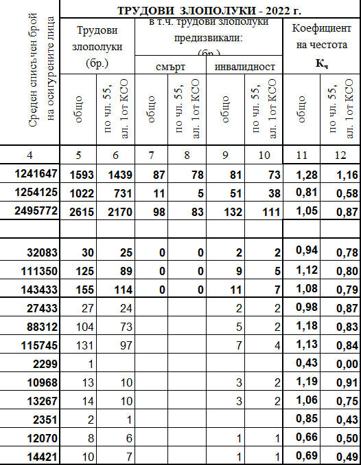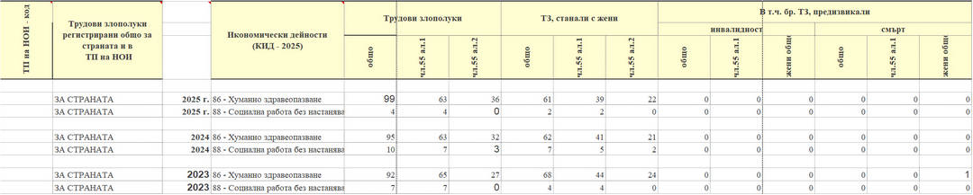 ТРУДОВИ ЗЛОПОЛУКИ-ХУМАННО ЗДРАВЕОПАЗВАНЕ И СОЦИАЛНА РАБОТА: За по-лесна съпоставимост на българските данни с тези от доклада на Европейската агенция за безопасност и здраве при работа, е ползвана информацията на НОИ от 2022 г.
