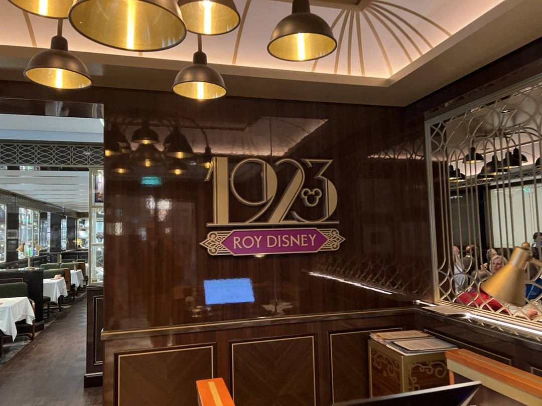 Ресторант "1923". Посещаваме го през октомври - около 10 дни преди 102-рата годишнина от основаването на студио "Братя Дисни" в Холивуд от Уолт и Рой Дисни. Заведението, кръстено на епохалната за анимационното кино 1923 г., е разположено на трета палуба на петия от шестте круизни кораба от флотата на Дисни круиз лайн (Disney Cruise Line). Менюто е представено като "изискани ястия" и смесица от европейска, азиатска и южноамериканска кухня, но, честно казано, едни спагети биха ощастливили значително повече небцето ми. Ресторантът има две страни. В зависимост от ротацията, едно семейство или компания по време на пътуването може да заеме маса само от едната страна, но нищо не пречи да се разгледа и другата по време на закуска или обяд. И стените, и витрините по стените и между двете части на ресторанта, както и пред него, са изпълнени с филмови сувенири, първи скици на герои, дори реквизит от анимационните филми "Питър Пан" (1937 г.), "Алиса в страната на чудесата", "Пепеляшка" (от 1950 г.), "Снежанка" (1937 г.) и множество други неостаряващи ленти. Вълнуващо пътешествие във времето на