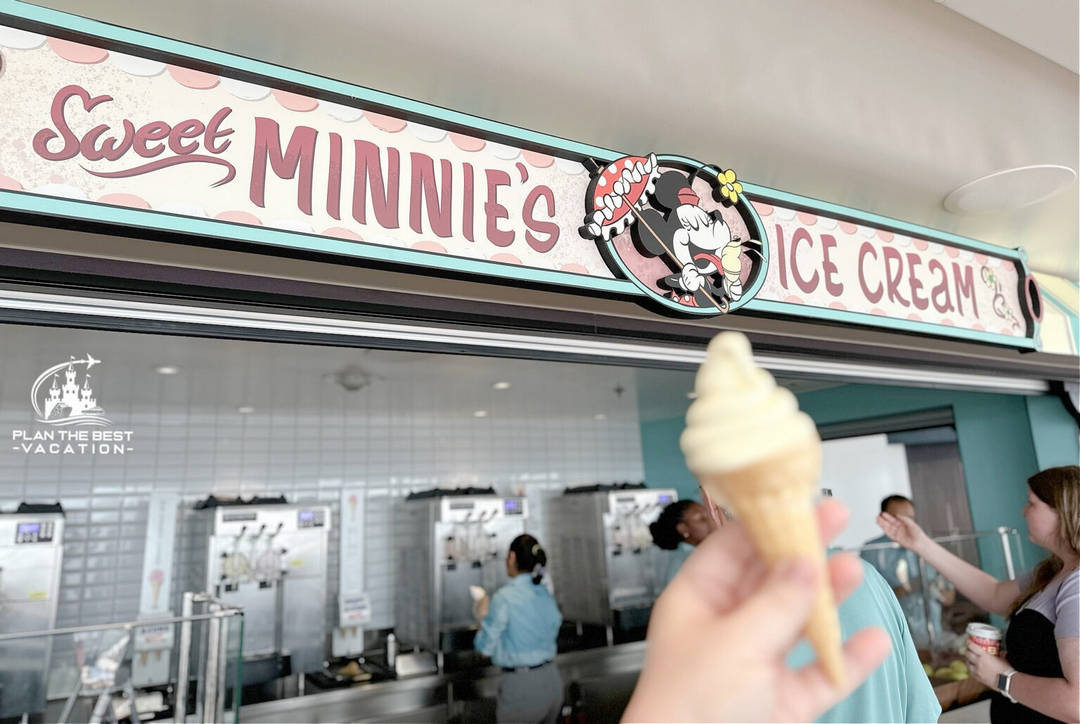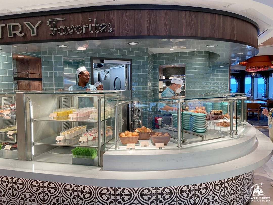 Персоналът на десетте пункта за хранене тип кафене/бюфет изключително бързо и любезно обслужва дългите опашки за първия обяд. Търпеливи са дори към колебаещите се и по нрав мрънкащи клиенти. Косите на всеки готвач или обслужващ зад бюфетите са прибрани в мрежа, както и брадите на мъжете, всеки е с ръкавици и без петънце по снежнобелите престилки. Бюфетите на 11-ия етаж, работещи почти целодневно, предлагат тематично меню: "Барбекюто на Мики "Смоукстек", "Кантината на Доналд", "Пица пайовете на Дейзи", "Скарата на Гуфи", "Сладоледа на Сладката Мини", а магазинът за сладкиши и шоколад (ммм... бих останала край тези лакомства през цялото пътуване!) е вдъхновен от компютърно анимирания филм "Отвътре навън" и гостите се снимат в компанията на двуметровите статуи на героите.