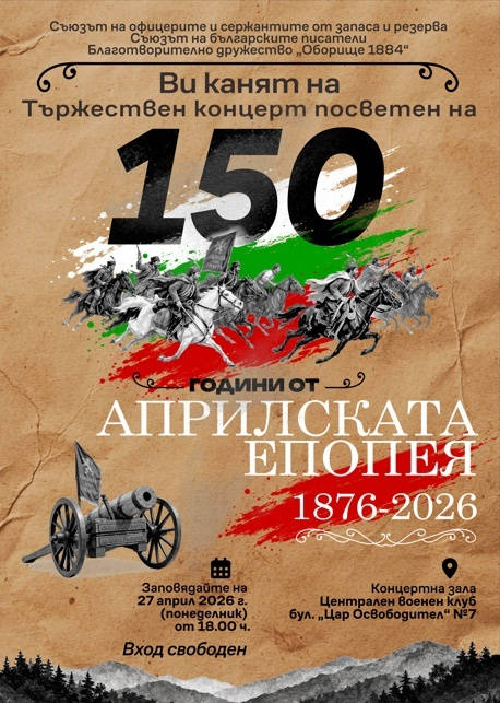 Съюзът на офицерите и сержантите от запаса и резерва, Съюзът на българските писатели и Благотворително дружество "Оборище 1884" канят на Тържествен концерт, посветен на 150 години от Априлската епопея. Той ще се състои на 27 април от 18 ч. в Концертната зала на Централния военен клуб в София. Входът е свободен.
