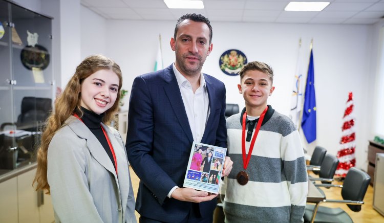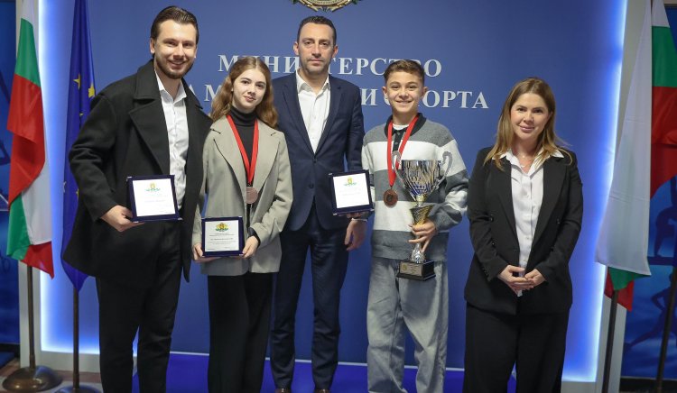 Министър Пешев награди младите ни състезатели Кристиян Дончев и Мартина Кондаклиева, които спечелиха бронзов медал на Световното първенство по спортни танци за юноши в Бургас.