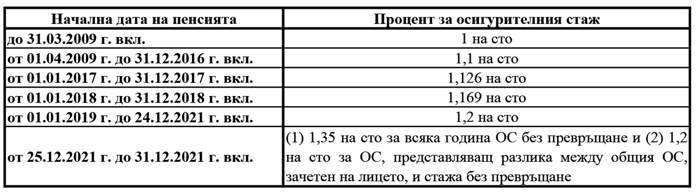 Стойностите на процента за зачетените години осигурителен стаж в зависимост от датата на отпускане на пенсията