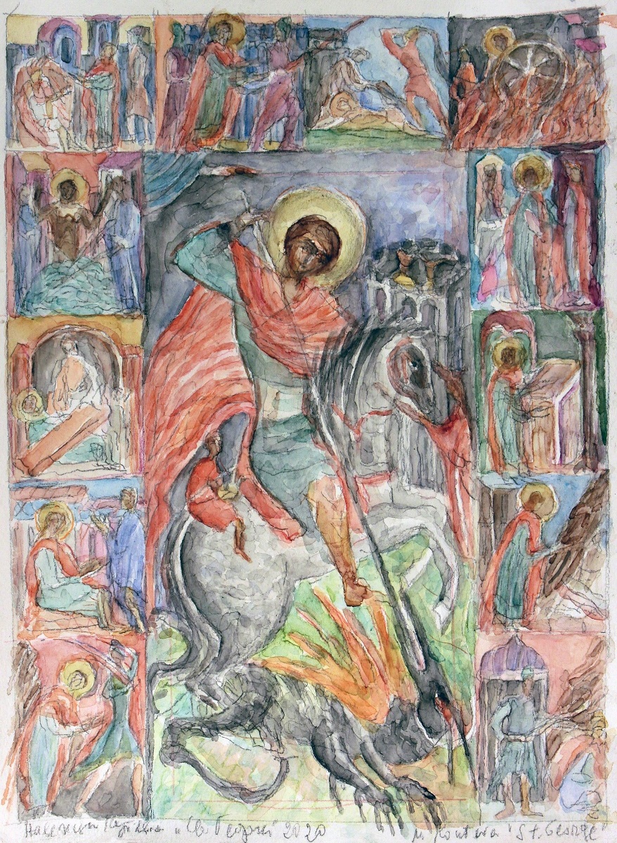 "Образите на тези светии са илюстрирани в иконографията в множество миниатюри, които обрамчват светията с изображения на неговото битие и чудесата, които е извършил. От тези житийни сцени се опитах да създам отделни кавалетни картини, придържайки се към строгата стилистика на иконографията, но изграждайки фигурите в обемно-пространствена среда. Що се отнася до пейзажа, там използвам рисунки на скалите около Погановския манастир, така възхитено обрисувани от Алеко Константинов в пътеписа "Швейцария ли?".