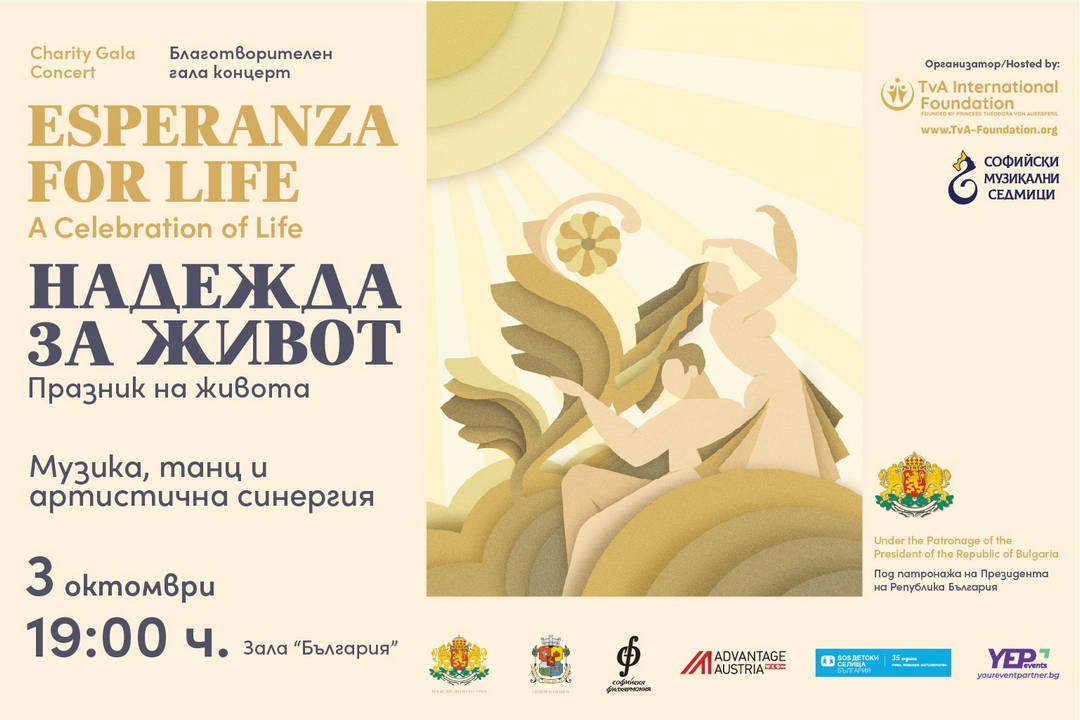 Грандиозният благотворителен галаконцерт и спектакъл "Esperanza for Life" ("Надежда за живот"), организиран от Международната фондация "Теодора фон Ауерсперг" на родената у нас принцеса Теодора фон Ауерсперг, ще се състои на 3 октомври от 19 ч. в столичната зала "България", научи ДУМА от Мартина Панайотова. Събитието е под шапката на "Софийски музикални седмици 2025" и бележи тържествения финал на добре познатия международен фестивал за класическа музика. Средствата от продажбата на билети ще бъдат насочени към две каузи: подпомагане на Център за обществена подкрепа - Перник, на SOS Детски селища България в помощ на деца и семейства в риск, чрез дейности, насочени към подкрепа за семейството и превенция на раздялата; събиране на средства за изграждане на първия по рода си холистичен център в помощ на деца в нужда и безстопанствени животни, носещ името "Есперанса за живот".