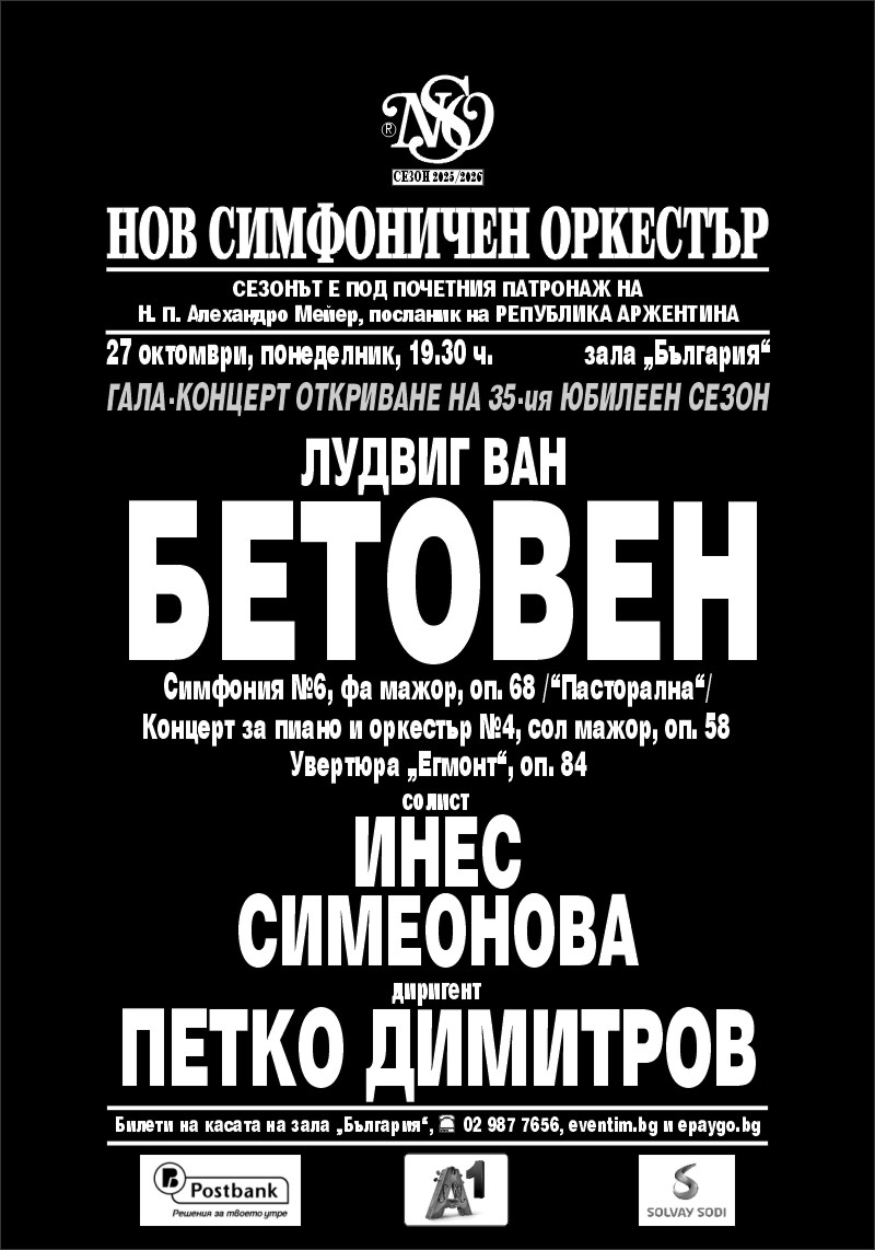 НОВ СИМФОНИЧЕН ОРКЕСТЪР открива 35-ия си сезон изцяло с Бетовенова програма - Симфония №6, „Пасторална“ и Концерт за пиано №4, солист Инес Симеонова, диригент Петко Димитров. 27 октомври, понеделник, 19.30 часа, зала „България“!