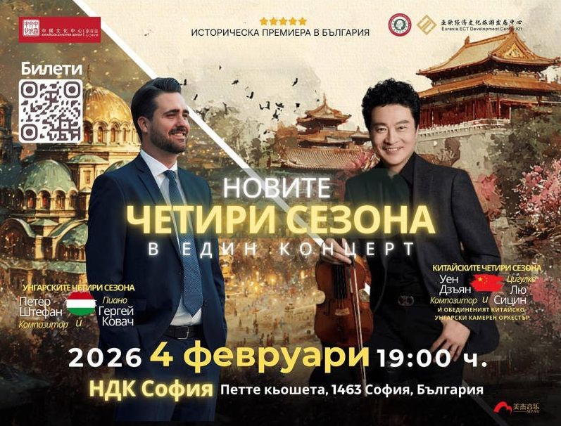 Необичаен концерт ще се състои на 4 февруари от 19 ч. в Зала 1 на НДК, научи ДУМА от Институт Лист - София. Ще бъдат изпълнени нови композиции, посветени на темата за сезоните. Входът е с билети. В програмата: "Четирите годишни времена на Китай" (Уен Дзъян), изпълняват: Лю Сицин, цигулка, и Обединеният китайско-унгарски камерен оркестър (Beijing Major Ensemble & Bela Bartok Symphony Orchestra); "Унгарските четири годишни времена" (Петер Щефан), солист - Гергей Ковач, пиано. Унгарската творба предлага нов средноевропейски и хунски поглед, докато китайската композиция представя първата източна интерпретация на сезоните. Заедно те преплитат автентични фолклорни елементи, камерни структури и солистично майсторство.