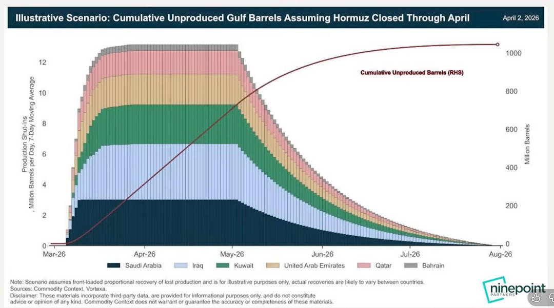 Според анализатори вече сме достигнали почти 13 милиона барела на ден спрян добив. Графиката допуска отваряне на протока към края на април и постепенно завръщане на този нефт на пазара. Червената крива показва кумулативната загуба на доставки, която ще достигне 1 милиард барела още в средата на юни.