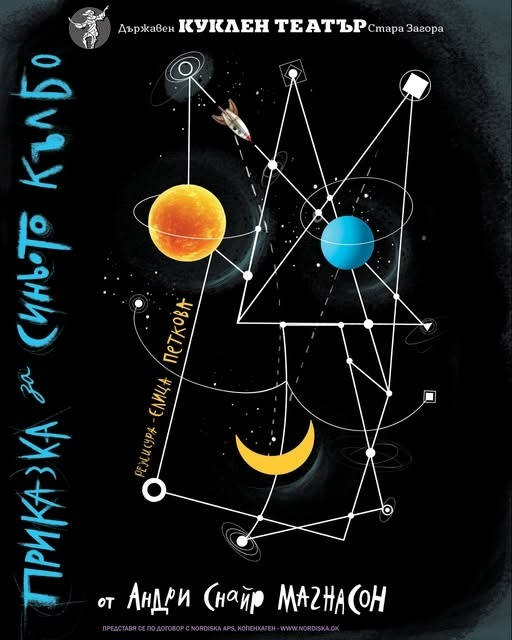 Премиерата на "Приказка за синьото кълбо" от Андри Снайр Сверисон предстои на 13 февруари от 18 ч. и на 15 февруари от 11 ч. в Старозагорския куклен театър. Преводът е на Айгор Сверисон, драматизацията и режисурата са на Елица Петкова. Автори на сценографията и плаката са Ива Гикова и Ивайло Николов, музиката е на Пламен Петков, мултимедията - на Тодор Киряков. Участват: Василена Чернаева, Деница Янакиева Георгиева, Таня Георгиева, Калоян Георгиев, Кирил Антонов, Любен Чанев. Препоръчителната възраст за спектакъла е 6+г., научи ДУМА от Велизара Цонева. На една синя планета далеч в космоса живеят само деца - свободни и безгрижни. Но появата на загадъчен непознат променя всичко: той ги учи да летят, като отърсват прашеца от крилата на пеперуди. Започва опасно и вълнуващо приключение през тъмни гори и открити небеса, което поставя на изпитание тяхното приятелство, смелост и изобретателност.