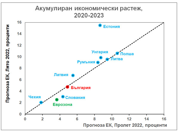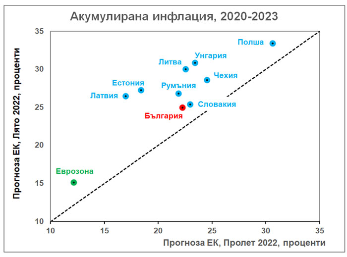 В прогнозата на ЕК "лято 2022" България се откроява с най-ниска инфлация за 2020-2023 г. сред страните СИВ-ЕС - средногодишно от 5,7%. По-различно са изглеждали нещата в прогнозата "пролет 2022" на ЕК, когато три страни СИВ-ЕС се е предвиждало да са с по-ниска инфлация. В това отношение войната на Русия в Украйна се предвижда да повлияе по-умерено у нас.