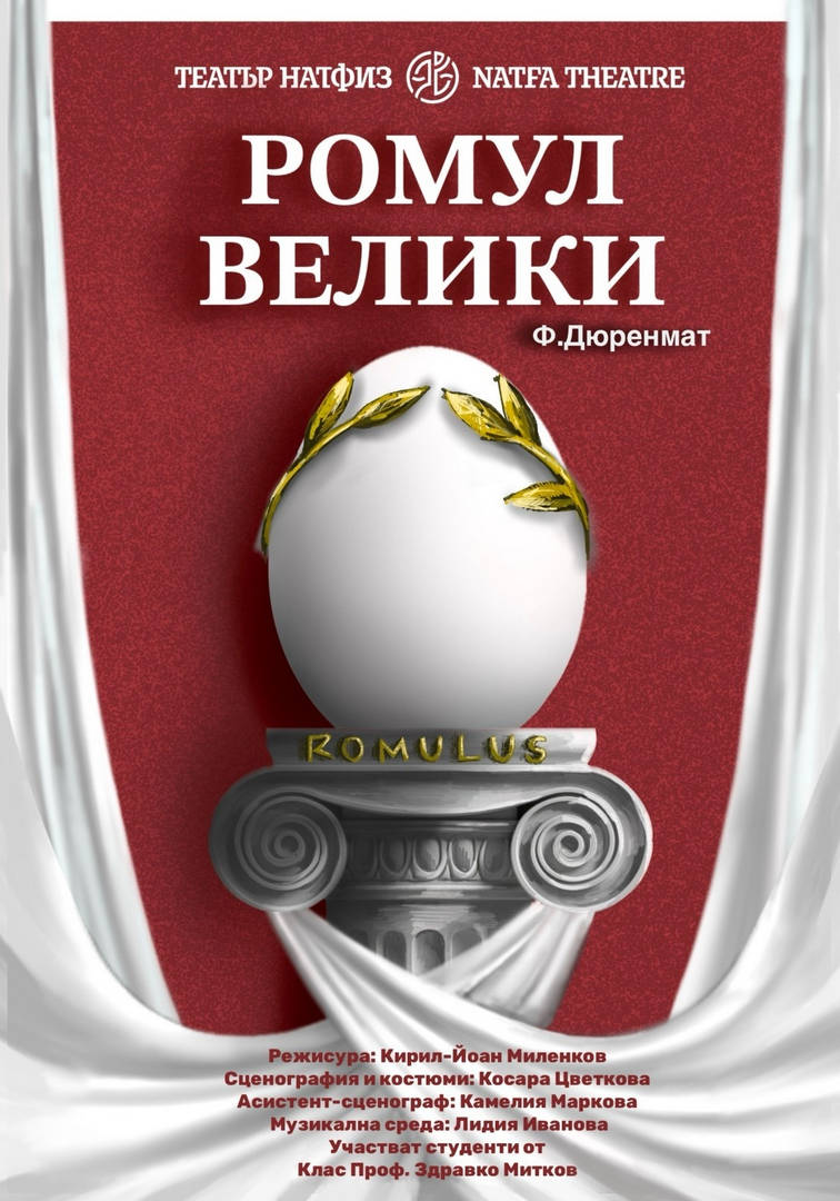 Премиерата на "Ромул Велики" от швейцарския драматург Фридрих Дюренмат ще се състои на 29 април от 19,30 ч. на Сцена 47 в НАТФИЗ. Написана в края на 40-те години, пиесата представя последните часове на Западната Римска империя и носи подзаглавието "неисторическа историческа комедия" - определение, което подчертава търсената свобода в интерпретацията на фактите и фокуса върху моралните и философските измерения на събитията. Режисьор е Кирил-Йоан Миленков - абсолвент от специалност "Режисура за драматичен театър" в класа на проф. Здравко Митков. Сценографията и костюмите са на Косара Цветкова и Камелия Маркова, а музикалното оформление - на Лидия Иванова. Участват абсолвентите от специалност "Актьорство за драматичен театър" от класа на проф. Здравко Митков: Момчил Христов, Рая Крумова, Марина Фърцова, Мартин Великов, Мартин Йорданов, Михаил Трендафилов, Матей Иванов, Елизабет Лука, Камен Стефанов, Иван Николов, Виктор Стоянов и Драгомир Койчев.