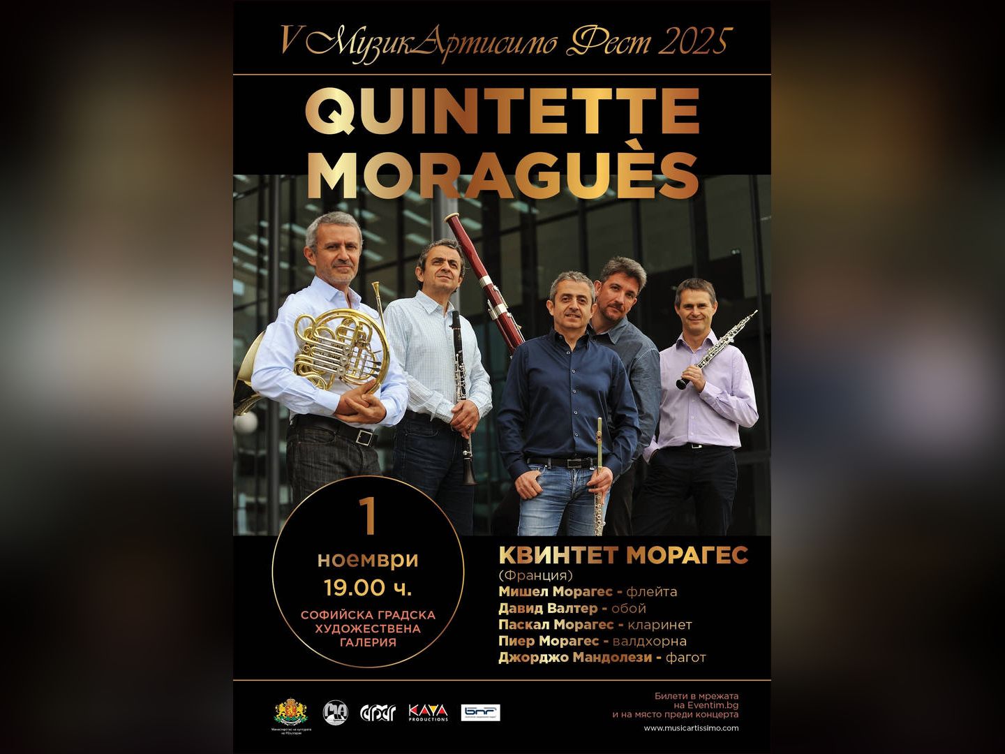 Международният фестивал "МузикАртисимо фест" представя на 1 ноември от 19 ч. в Софийската градска художествена галерия един от най-прочутите духови квинтети на нашето време - френския "Морагес": Мишел Морагес (флейта), Давид Валтер (обой), Паскал Морагес (кларинет), Пиер Морагес (валдхорна), Джорджо Мандолези (фагот).