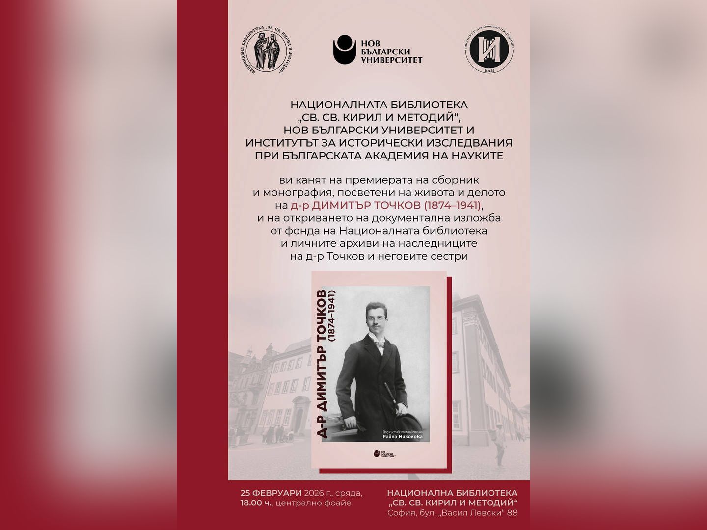 Премиерата на сборник и монография, посветени на живота и делото на д-р Димитър Точков (1874-1941), и откриване на документална изложба от фонда на Националната библиотека и личните архиви на наследниците на д-р Точков и неговите сестри ще се състоят на 25 февруари от 18 ч. в централното фоайе на НБКМ.