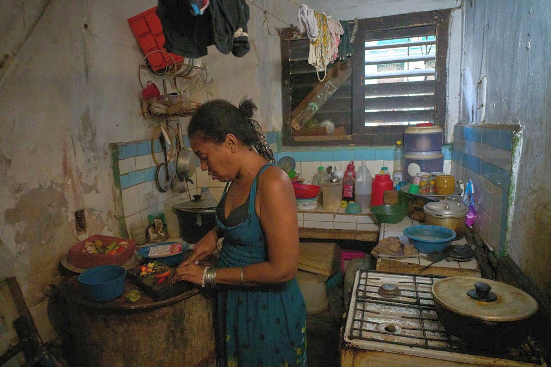 Кубинка приготвя вечерята за семейството си. Доставените хуманитарни помощи от различни държави са разпределени сред населението и има по-голямо разнообразие от храна