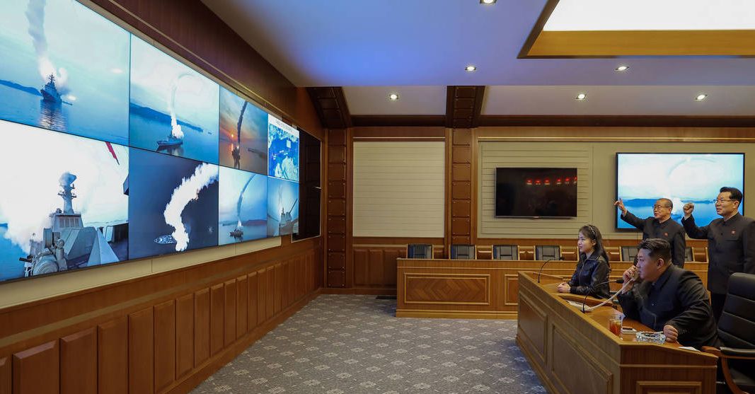 Севернокорейският лидер Ким Чен Ун и дъщеря му гледат на видеозапис изстрелването на крилати ракети от военноморски разрушител. Тестът бе извършен в момент на повишено напрежение на Корейския полуостров заради съвместни военни маневри на Южна Корея и САЩ