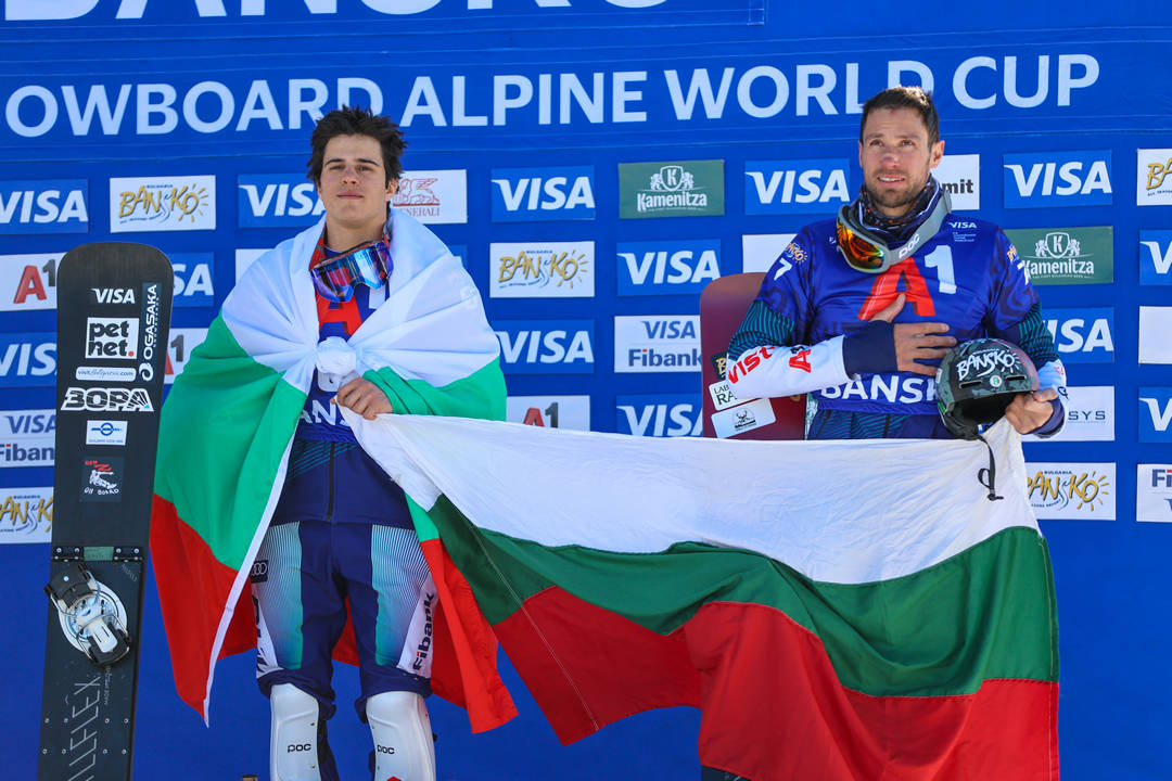Шампионът Тервел Замфиров (вляво) и бронзовият медалист Радо Янков се радват на почетната стълбица след старта от Световната купа по сноуборд в Банско. Представянето е историческо, защото за пръв път на подиума се качват двама българи. При дамите 16-годишната Малена Замфирова записа четвърто и пето място