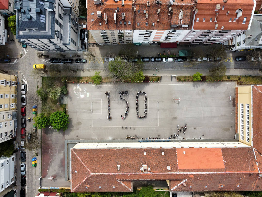 Ученицитe от 127. СУ "Иван Н. Денкоглу" изписаха с телата си в училищния двор числото 150 в чест на 150-годишнината от Априлското въстание