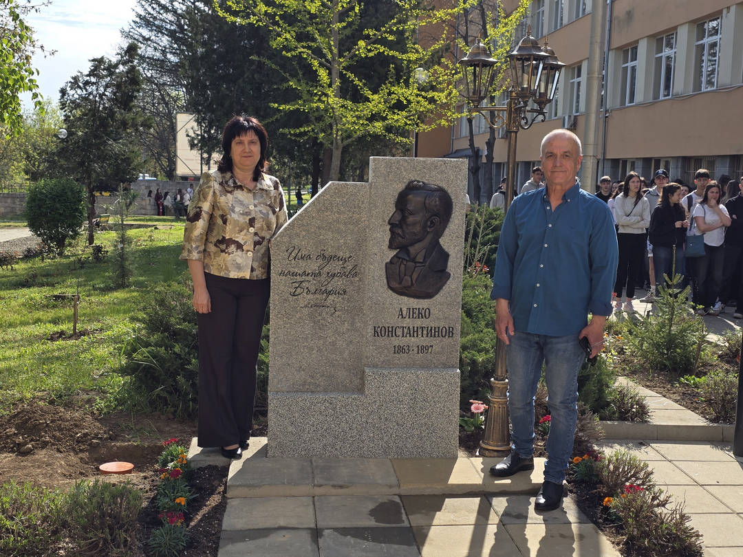 В плевенската Професионална гимназия по туризъм "Алеко Константинов" с официална церемония откриха барелеф на патрона на училището. На снимката: директорката на училището Малинка Маринова и авторът на барелефа - скулпторът Венцислав Василев