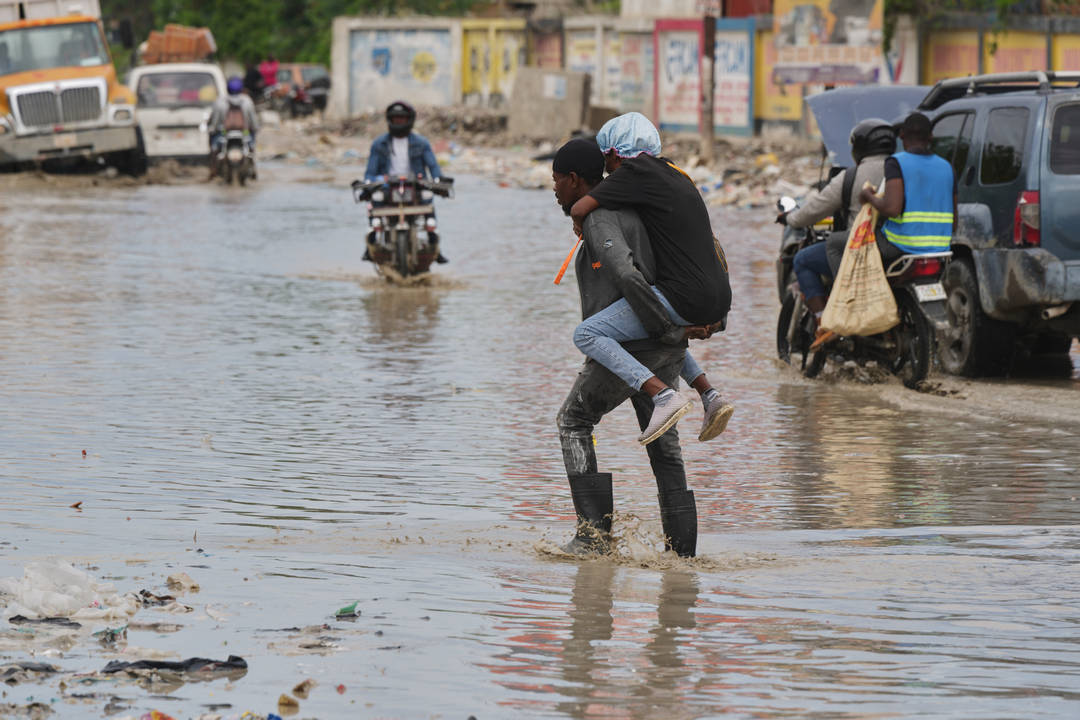 Мъж в Хаити пренася жена през наводнена улица в столицата Порт о Пренс. Страната е засегната от обилни валежи