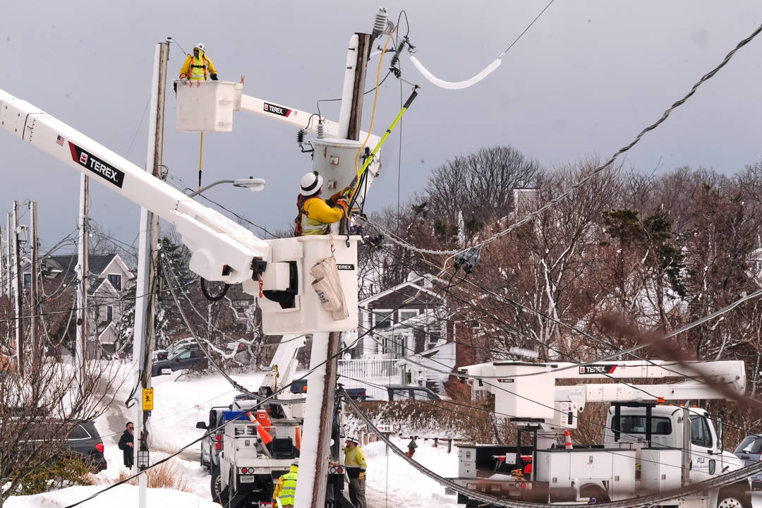 Техници възстановяват електрозахранването в град Плимут, щата Масачузетс. Зимна буря в района доведе до натрупването на над 60-сантиметров сняг