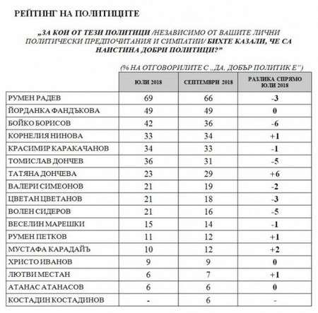 На практика всички представители на управляващите, без столичния кмет Йорданка Фандъкова, бележат сериозен спад в обществената си популярност. Най-сериозен е ударът върху премиера Бойко Борисов. За един месец той е загубил 6% от личния си рейтинг, следван от Волен Сидеров (- 5%); Томислав Дончев (- 5%); Цветан Цветанов (-3%).