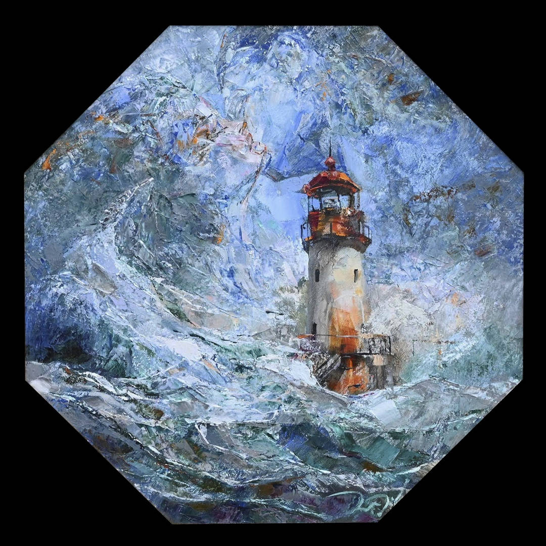 Водата е всевластна и неукротима - вдъхваща едновременно възхищение и страх със своята първична красота и мощ. Морето не е романтичен фон, а активна сила, с която човекът - чрез своите създания и символи - влиза в диалог. Осмоъгълният формат концентрира погледа и превръща сцената в почти медитативно пространство. Зрителят е въвлечен в центробежното движение на мазките, но отново и отново се връща към вертикала на фара - тих, но ясен знак за присъствие и устойчивост.