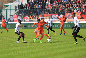 Николай Димитров (с топката) се опитва да се измъкне от клещите на Огуде и Идову от Амкар в мача от 18-и кръг във Висшата лига на Русия, спечелен от Урал с 1:0